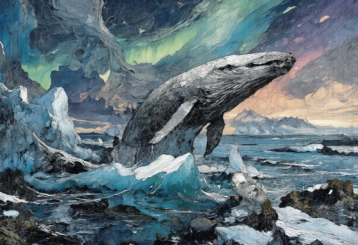 A majestic humpback whale breaches the surface of a shimmering, turquoise Arctic sea, its massive form silhouetted against the ethereal glow of the Northern Lights. Iridescent green and purple auroras dance across the night sky, casting an otherworldly light on the whale's glistening skin. Nearby, a pod of narwhals glides gracefully, their spiraled tusks gleaming in the celestial radiance. Floating ice floes dot the water's surface, reflecting the auroral display and creating a dreamlike mosaic. In the distance, jagged ice cliffs loom, their crystalline faces etched with millennia of history. A curious Arctic fox perches atop a nearby ice chunk, its white fur tinged with the surreal colors of the aurora. Schools of silvery Arctic cod dart beneath the surface, their scales catching flashes of the celestial light show. The scene captures the raw beauty and harmony of Arctic marine life, rendered in stunning 8K detail, with an atmosphere that blends the magical with the majestic. Intricate patterns of refracted light play across the whale's barnacle-encrusted skin, while the auroral glow casts long, ethereal shadows across the icy seascape. <lora:Anime v1.3:0.4> <lora:Illustration_Style_IV:0.5> <lora:flux_dev:1>