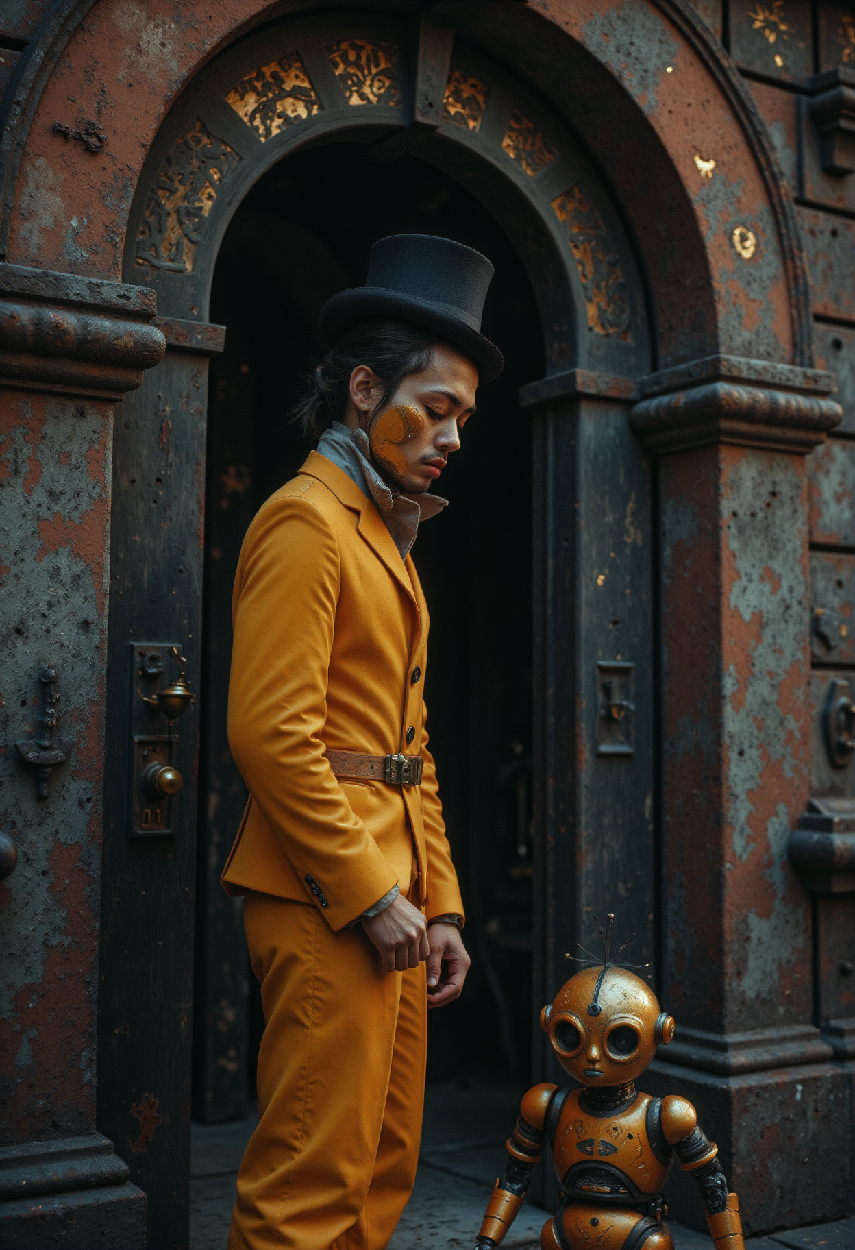 A poignant scene unfolds under the gentle twilight glow of an otherworldly landscape/ inspired by Insular Medieval art. The dominant tones are violet Mocha with blind Dark Goldenrod highlights for striking contrast. In this mystical realm stands a melancholic figure: a skinny man in a top hat who wears a bright yellow futuristic suit that is too large for him/ its long sleeves hanging down and oversized yellow pants billowing around his feet. His sadness permeates the air as he dons a small ceramic mask with black eye sockets/ adding an eerie touch to his already somber demeanor. By his side stands a small toaster robot that appears out of place in this ancient and dangerous metal portal-like background. The scene captures a sense of longing and isolation/ transporting viewers into the heart of this ethereal world where time and technology intertwine tragically.