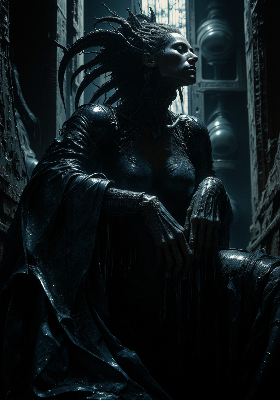 a high quality digital art of an eerie and captivating "opera diva" with intricate biomechanical elements inspired by the style of H. R. Giger. The diva is depicted with exaggerated features like a dramatic gown, elaborate hairstyle, and intense facial expressions. The background is a dark and futuristic setting reminiscent of Giger's iconic artworks, filled with industrial textures and mysterious lighting. The image is rich in details, showcasing a blend of organic and mechanical elements that create a sense of otherworldly beauty. The focus is on the diva's haunting presence, combining the elegance of opera with the surreal and macabre aesthetics of Giger's unique style. This digital artwork is high resolution, full of dark and alluring tones, and intricately crafted to capture the essence of both the opera world and the distinct visual language of H. R. Giger. style of H. R. Giger