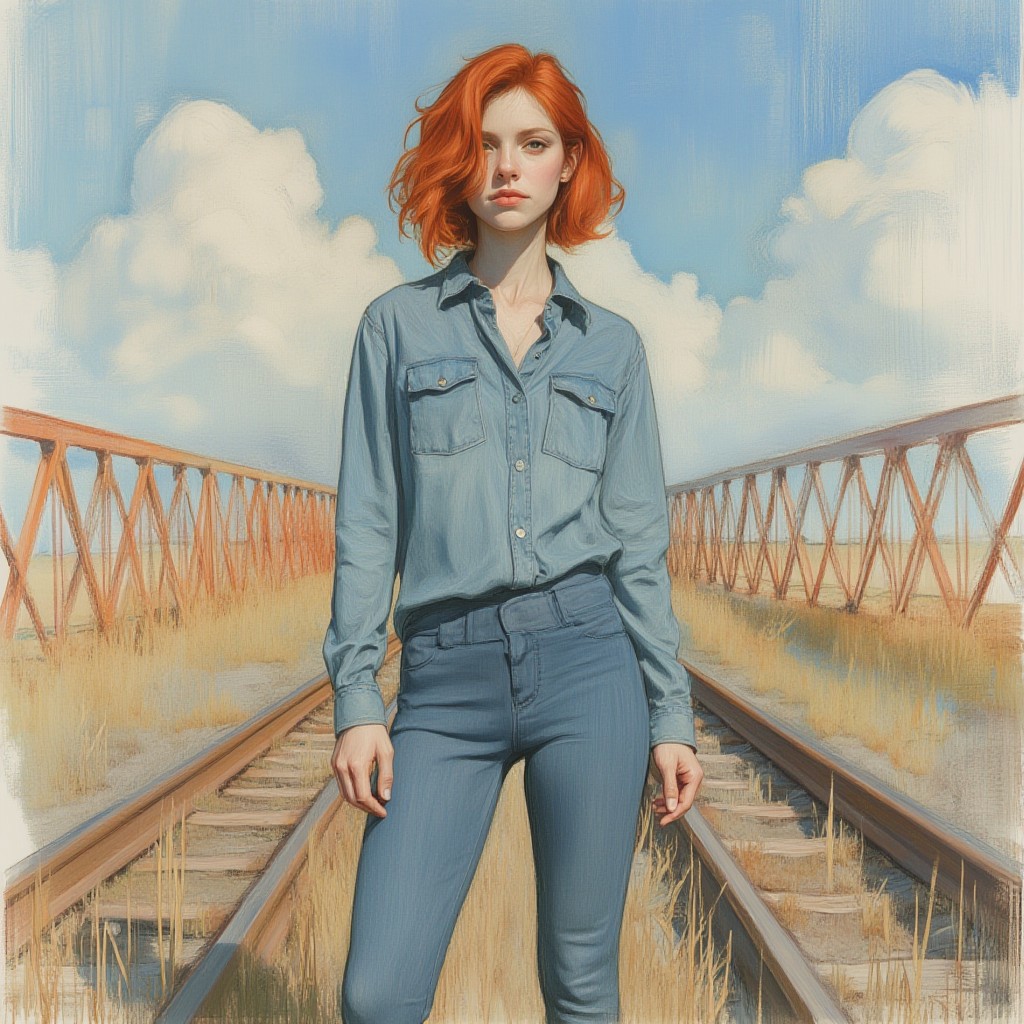 OBxiaoxiang, 1 girl, gorgeous redhead, tall, coy smile, shoulder length asymmetric hair, blue button down long sleeve shirt, blue form fitting yoga leggings, posing for photo, three quarter view, round hips, standing on railroad rails, sparse grasses growing between the rails, an orange steel bridge entrance behind, bright blue sky, dramatic shadows, impressionist acrylic cumulus clouds, by Ashley Wood, illustration by Alessandro 'Talexi' Taini,Stylized watercolor visuals, ultra detailed art, complex Illustration, Intricate, Complex contrast, HDR, Sharp, soft Cinematic Volumetric lighting, soft colors, award winning, masterpiece