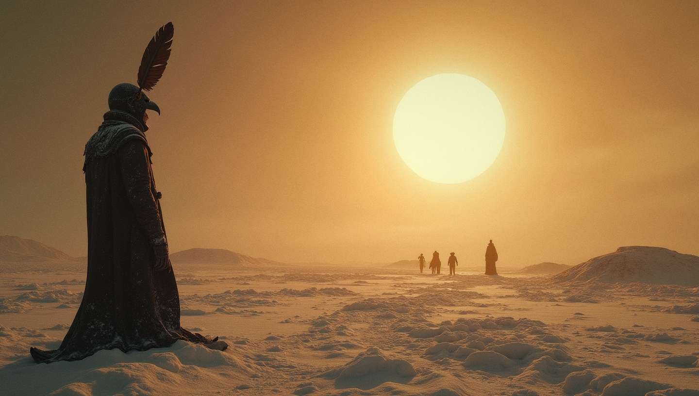 A captivating scene unfolds/ merging elements from various artistic influences: a Redshift dark-rendered landscape with the grandeur of Fredrick Judd Waugh's mastery and an urban surrealism reminiscent of Mike Judge. In this fantastical world/ our protagonist – Atheles – stands boldly before a vast horizon/ where secrets seem to beckon but remain tantalizingly out of reach. Thelebonant Catompane/ under the guidance of Egyptian deity Nedoubs/ oversees it all from above with his distinctive feather and piercing gaze/ while wonderlators maintain their duty amidst this enigmatic scene. Snow gently falls in sharp focus against a sepia filter that adds depth to the nostalgic ambiance. Pop art elements by Richard Phillips bring levity and humor to an otherwise mysterious tableau/ as if hinting at unexpected twists or surprises within. The combination of Vanitas/ loop lighting/ telephoto lens/ and intricate detail create a captivating blend that invites further exploration of this extraordinary world.