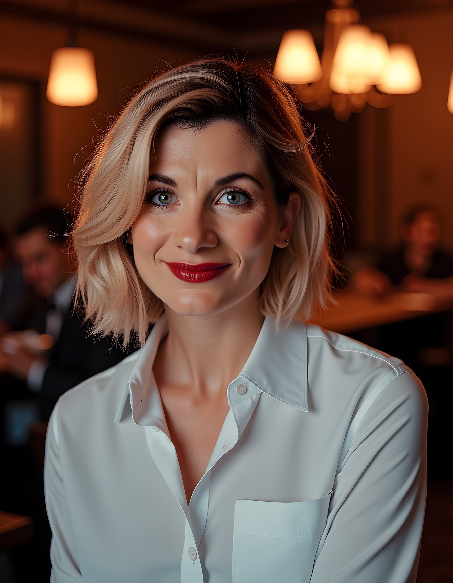 jodiewhitttaker, In a dimly lit, rustic studio adorned with warm, vintage lighting, Jodie Whittaker is captured in an intimate close-up shot. Her radiant, blue-eyed gaze locks onto the viewer, her short, blonde hair cascading softly around her face. Clad in a crisp, white shirt that complements her sun-kissed complexion, she flashes a captivating smile, her lips painted a bold, cherry red. The background is blurred, focusing the attention solely on her expressive upper body and the emotional depth conveyed through her gaze.