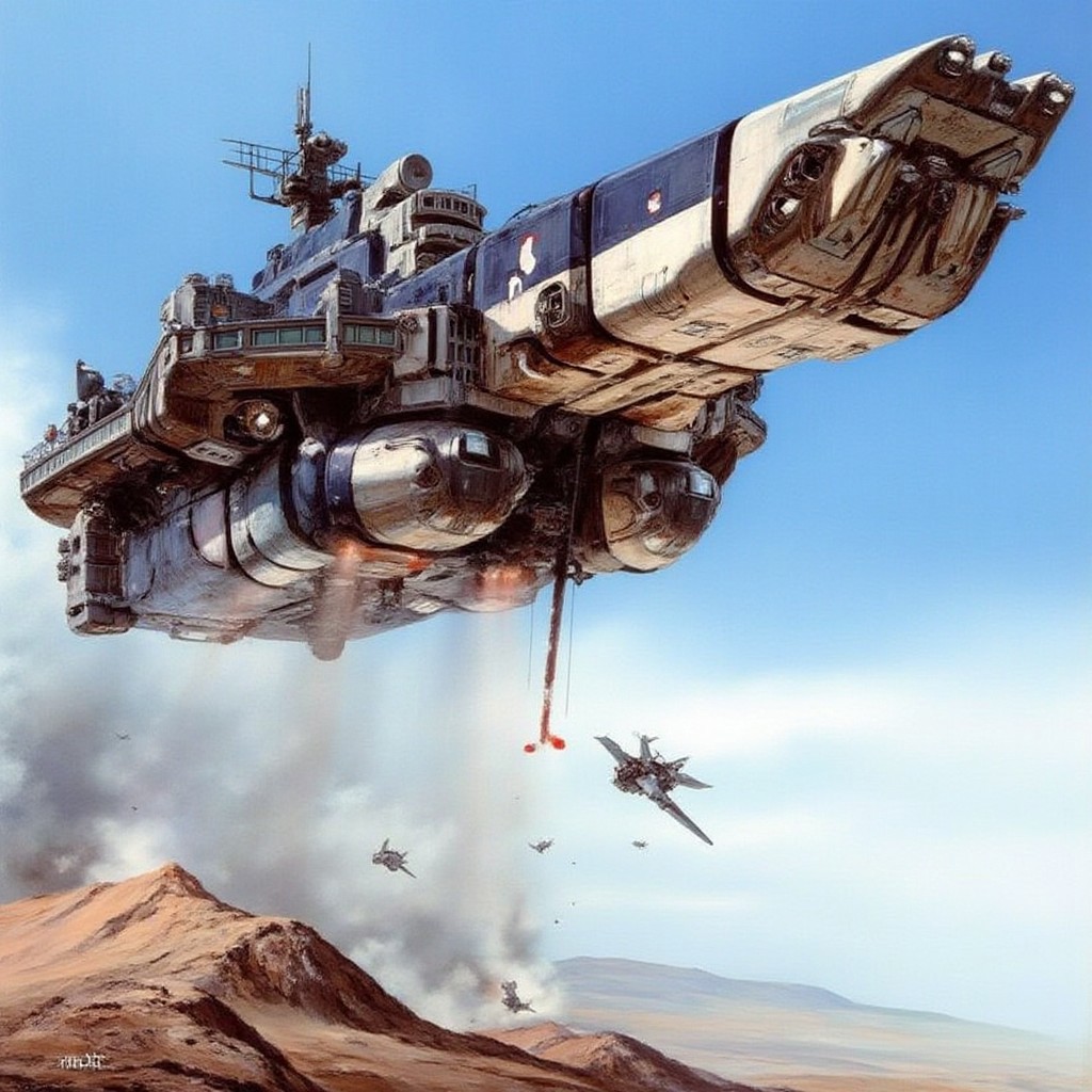 m9cha illustration. A futuristic, high-tech mothership or spacecraft, resembling a large, angular aircraft carrier, hovering above a barren, desert-like landscape. The spacecraft, painted in a mix of dark blue, silver, and white, has numerous antennas, sensors, and various equipment visible on its surface. It has a sleek, aerodynamic design with a long, pointed nose and a wide, flat bottom. we can see it rising from a far distance. majestic. but this is wartime. there is nothing grand about wars.