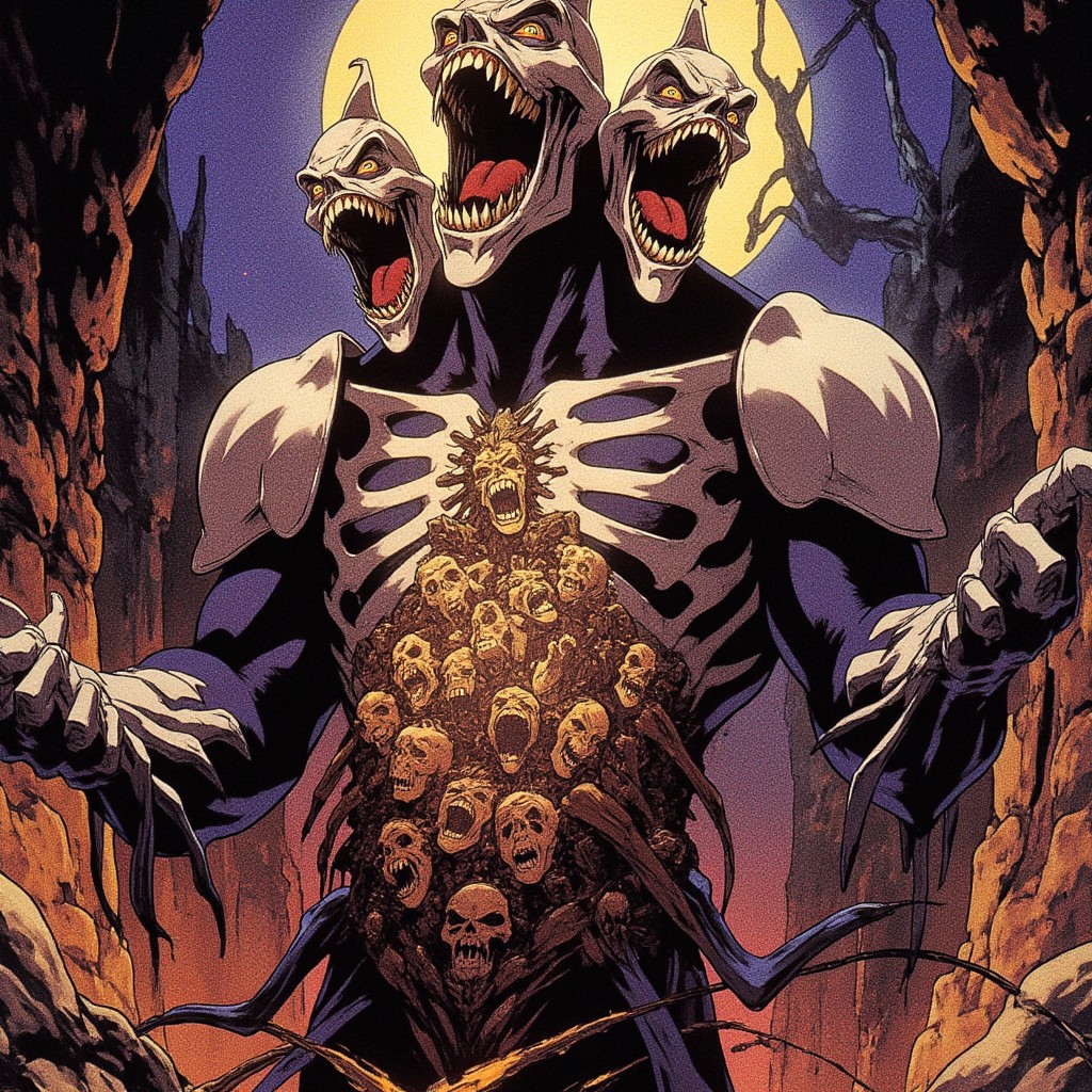 monster, three heads, many screaming faces on the stomach, many arms, bone plates, huge, muscle fibers, against a background of dark, fantasy catacombs