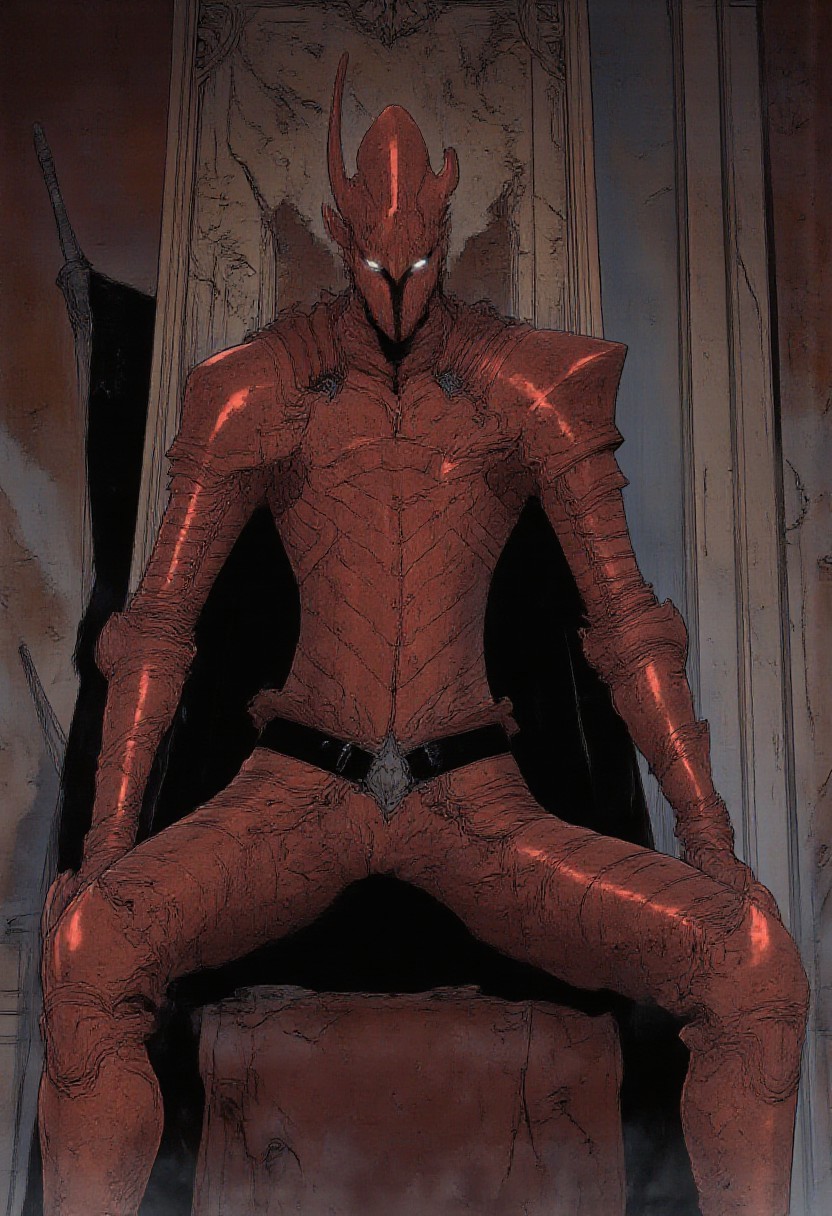 Jujutsu kaisen manga, 4k quality, (Perfect hand), 1male, !gris, knight, red armor, Fully in frame, head fully in frame, full body shot, !gris, emphasizing his dominance and battle-readiness., angular plates and dark engravings cover his battle-worn red armor. A black cape behind him. He sits on an ornate throne, leaning forward waiting impatiently. In an abandoned throne room. A sword in the stabbed into the ground next to him.