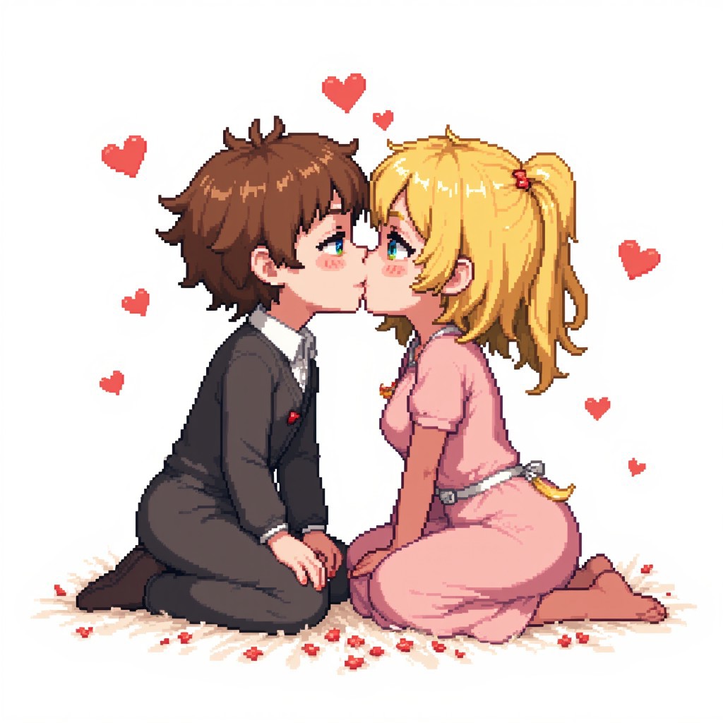 pixel art,cute girl, cute boy, kissing, hearts, valentine, vintage clothes