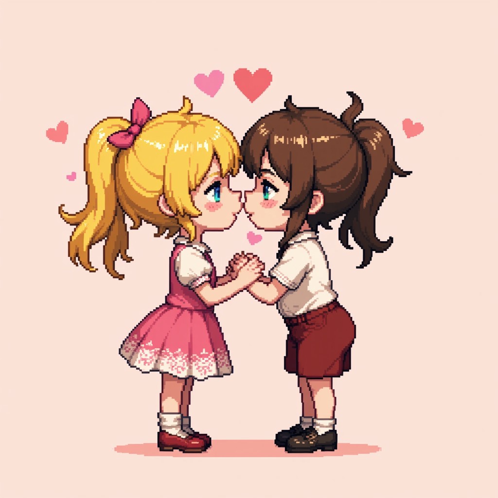 pixel art,cute girl, cute boy, kissing, hearts, valentine, vintage clothes