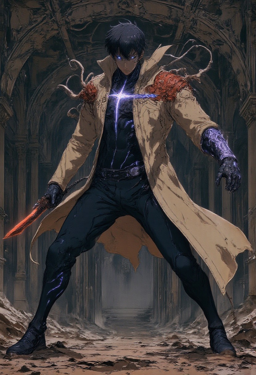 Jujutsu kaisen manga, 4k quality, (Perfect hand), (wide view), 1male, $ung, full body photograph of Sung Jin-Woo from Solo Leveling, High Level, Fully in frame, head fully in frame, full body shot, solo, He is wearing a long light brown trench coat, red shoulders. Black shirt, black pants, black jagged gauntlets with pulsating violet veins, short black hair, his eyes are blue, purple energy radiates from the outline of his body. (He is jumping in the air at the viewer:1.7). A red dagger is in his hand as he gets attacks. this image is full with intensity and furosity, In an abandoned throne room.