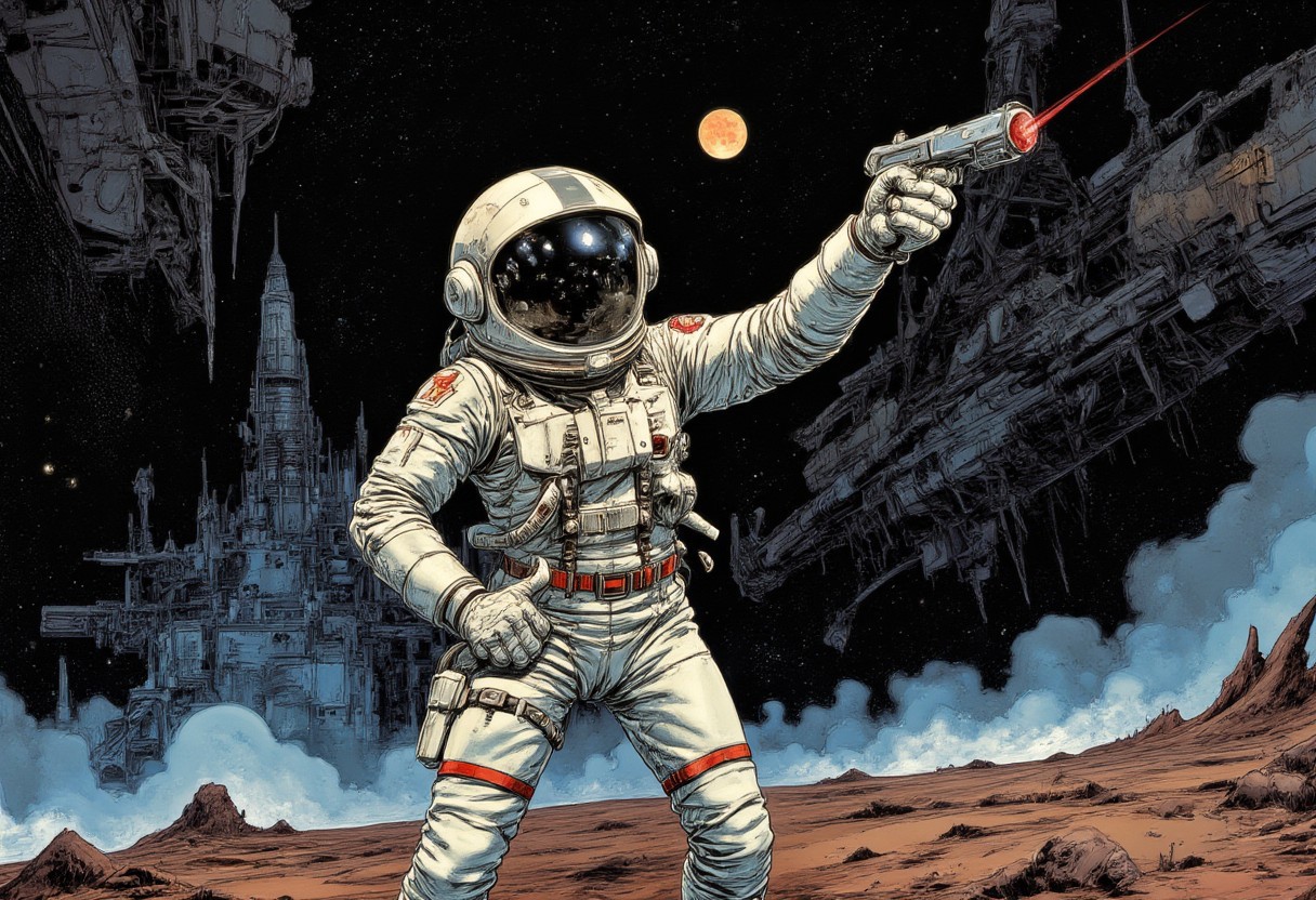 comic book art, a handsome male astronaut wearing sleek modern spacesuit holding a retro laser pistol on (A massive, ancient spaceship floating derelict in deep space.), retro sci-fi style, dynamic lighting, digital art, cinematic shot, fantastically beautiful, illustration, aesthetically inspired by classic sci-fi movies, by Paul Lehr by Jon Whitcomb, samdoesart, dreamlikeart.