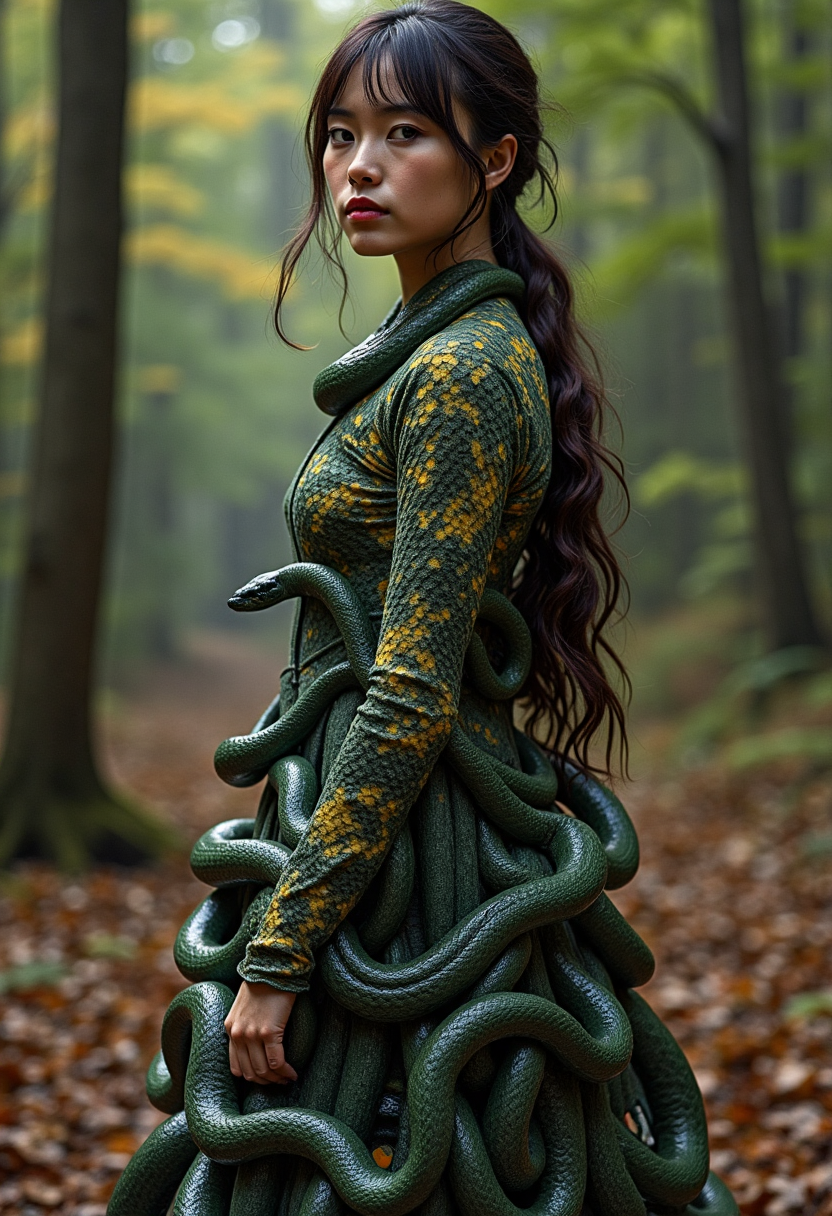 1woman, dress containing snakes, dress made of snakes, snake dress, snakes animal, multiple snakes