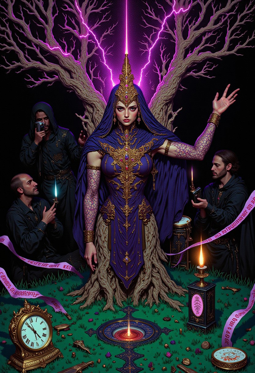A breathtaking digital abstract collage artwork featuring an ethereal woman in an opulent fantasy enchantress outfit, adorned with an intricate, gemstone-encrusted headdress that shimmers under surreal lighting. A flowing silk scarf with metallic embroidery wraps around her neck, with one end dramatically extending from the deep, atmospheric background into the vivid foreground. She is seated elegantly on the gnarled, twisting branches of an enchanted tree with luminescent dark pink leaves and richly textured purple wood, glowing subtly under soft ambient light. The ground is a lush carpet of vibrant, emerald-green grass. Scattered throughout are meticulously placed objects: an antique, gold-rimmed timepiece clock with exposed gears, a highly reflective CD partially buried in the grass, and three wax candles burning with flickering golden-orange flames, casting elongated shadows. In the distance, eerie, shadowy black figures with warped, distorted human forms hold sleek smartphones, their bright camera flashes piercing through the dreamlike haze as they capture forbidden images of the woman. Encircling the tree is a bold, high-contrast "Do Not Cross" tape, serving as a striking barrier against the intrusive paparazzi. The scene explodes with hyper-vibrant, neon-infused hues, blending surreal fantasy elements with abstract contrasts, creating an electrifying visual masterpiece.