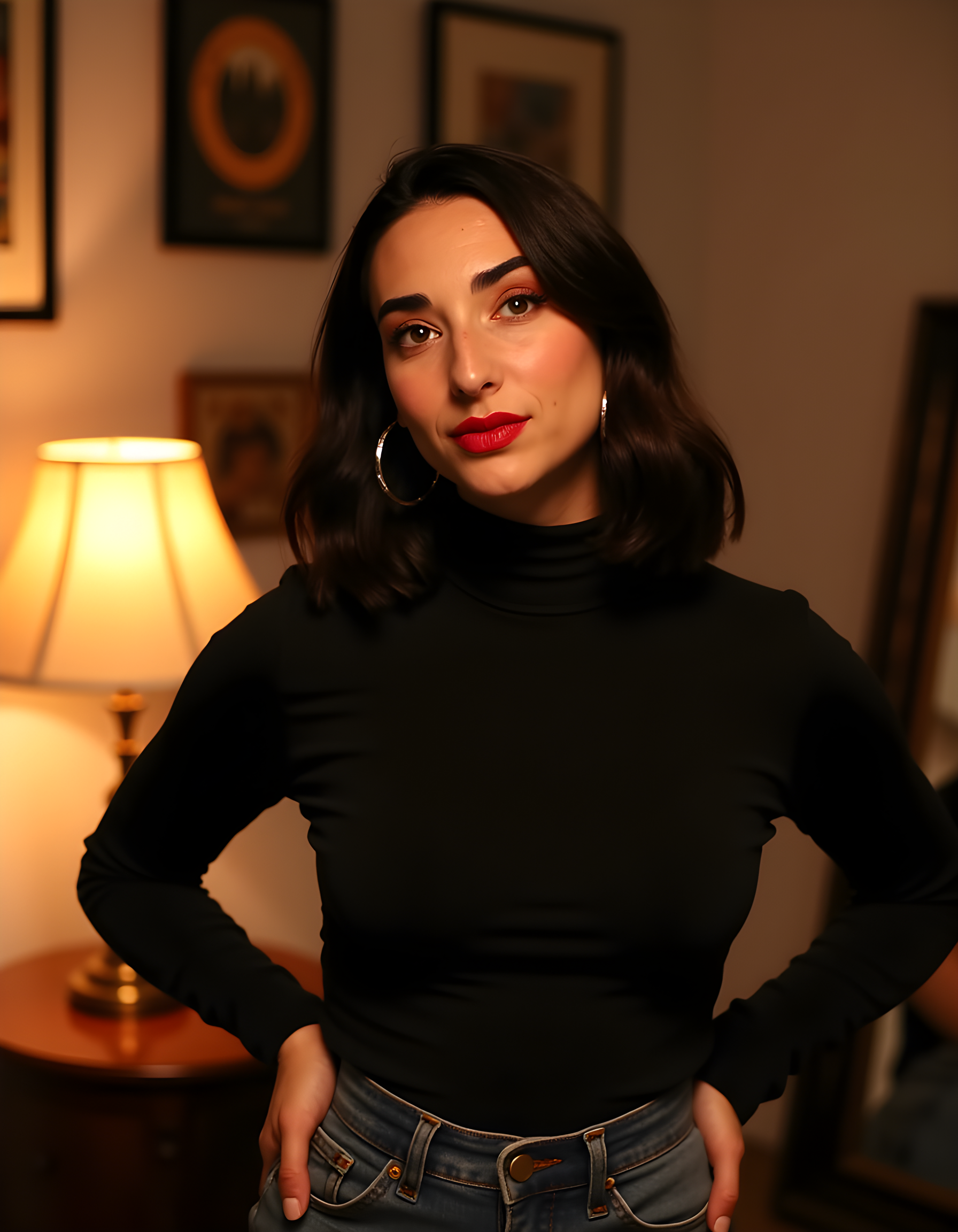 In a dimly lit, intimate studio adorned with vintage film posters and soft, warm amber lighting, the subject A88Y5 is captured in a captivating portrait. She stands before an antique mirror, her reflection casting a halo of soft light around her. Her raven-black hair cascades down her shoulders in loose waves, framing her striking brown eyes that hold an enigmatic gaze fixed directly on the viewer. Dressed in a chic black turtleneck and matching skinny jeans, she exudes confidence and allure. A pair of elegant silver hoop earrings dangle from her ears, catching the light as they sway slightly with each breath. Her full, luscious lips are painted a bold shade of crimson red, adding an air of mystery and glamour to the image. The camera angle is low, capturing her from just below the waist up, accentuating her posture and creating an intimate connection between subject and viewer, as if she's sharing a secret with only you. The emotional tone is one of quiet strength, self-assuredness, and unspoken vulnerability, making A88Y5 a captivating and intriguing figure in this evocative portrait.