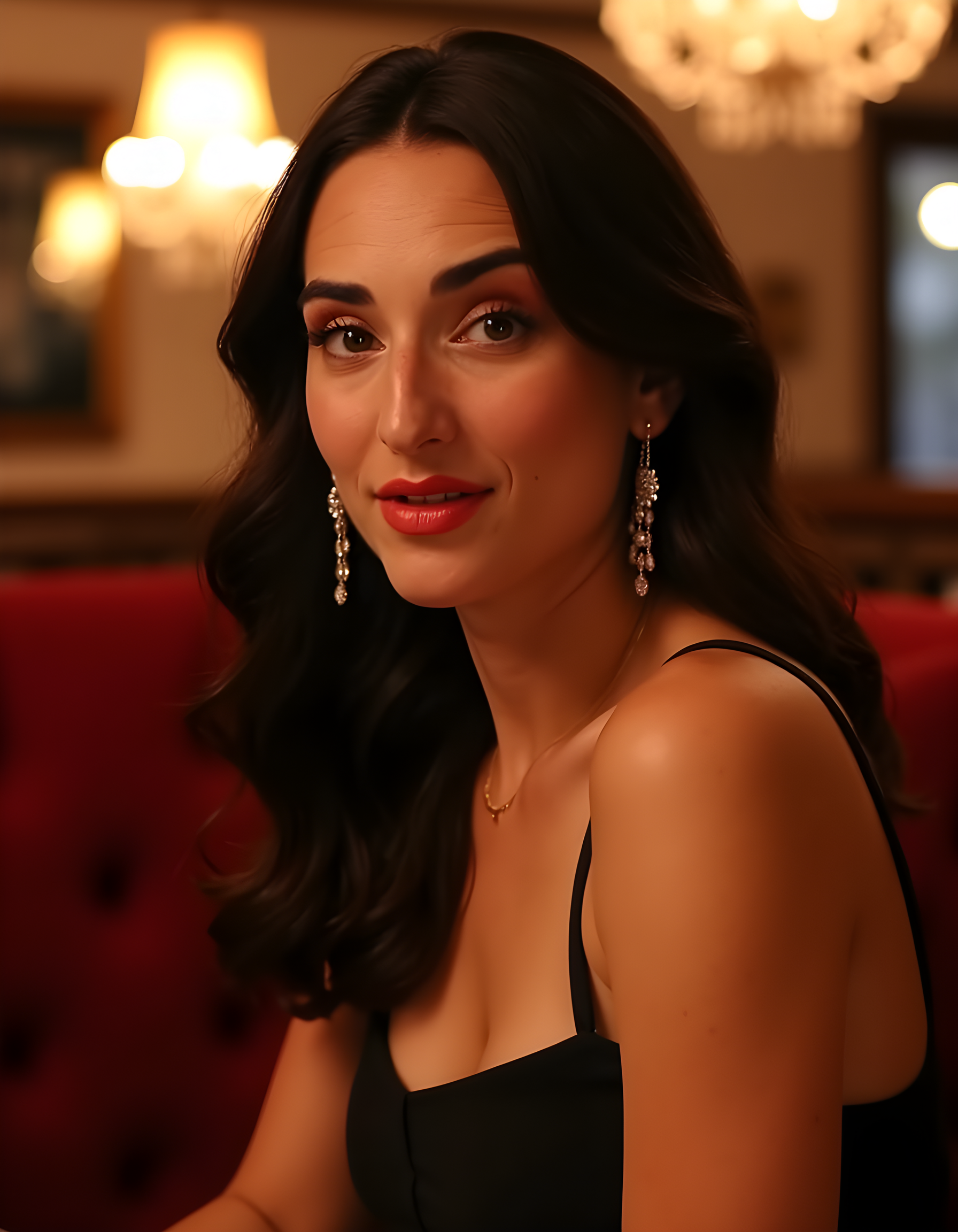 In a dimly lit, intimate jazz club bathed in the soft, amber glow of vintage chandeliers and red velvet booths, A88Y5, a woman of striking beauty with her hair cascading down her back like a raven waterfall, is captured from a low angle. Her eyes, the color of rich chocolate, sparkle with an infectious smile as she sips her drink, her long, elegantly dangling earrings reflecting the gentle dance of light around the room. Her outfit, a form-fitting black dress that accentuates her hourglass figure, is in stark contrast to the blurry, soft-focus background, creating an air of mystery and allure. The camera focuses on her lips, which are pursed in a sensual smile, as if she's about to sing along with the soulful melody drifting from the stage, capturing the essence of a confident, enchanting woman lost in the music.