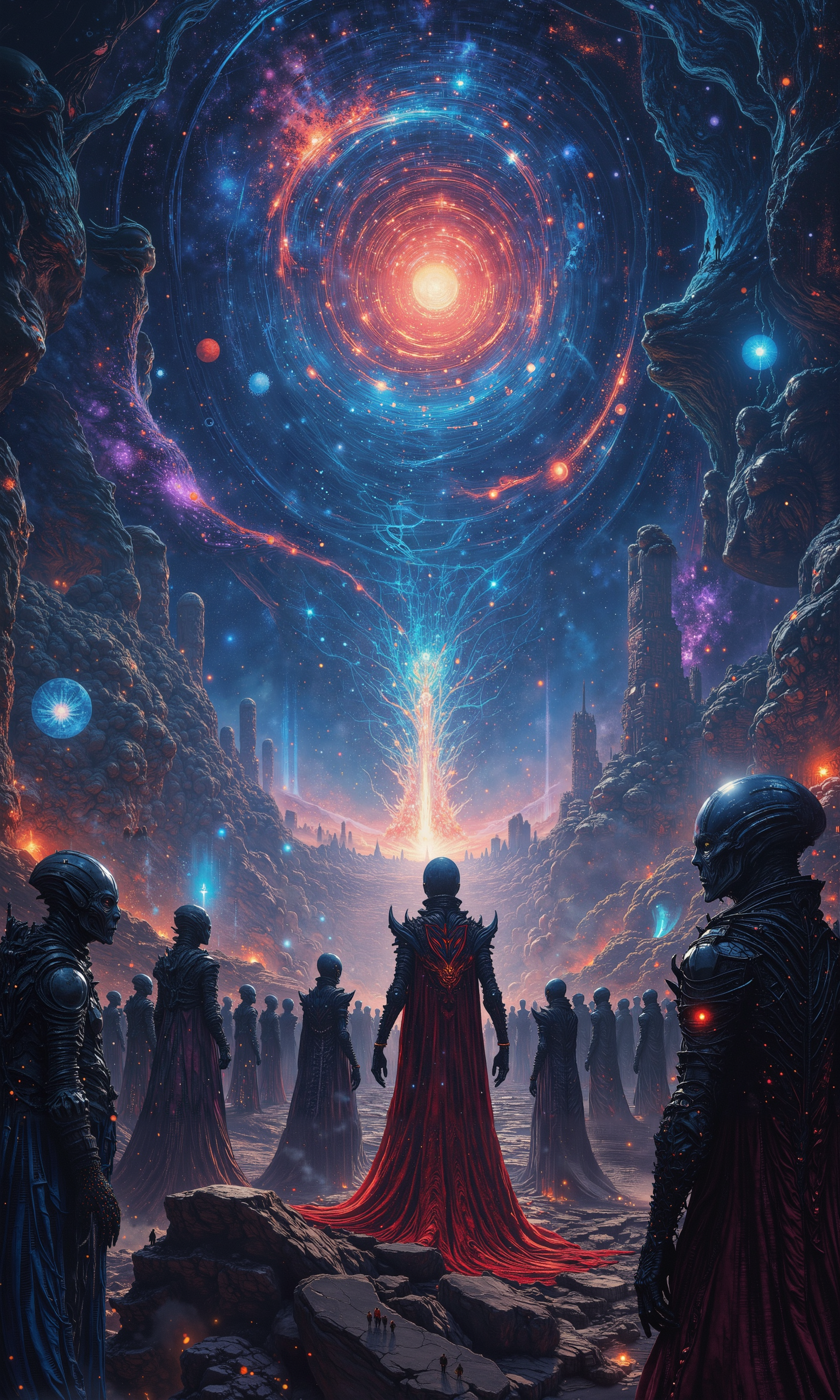 Majestic cosmic summit, diverse alien diplomats and human leaders converge in ethereal crystal dome. Bioluminescent flora, swirling nebula backdrop. Atmosphere of hope, unity. Intricate alien anatomy, regal human attire. Soft iridescent glow, shimmering translucent surfaces. Symbolic gestures of peace, floating holographic displays. Rich textures, otherworldly patterns. Emotional resonance, sense of awe. Photorealistic rendering, cinematic lighting. 8k resolution, hyper-detailed. Masterpiece quality, professional photography. Epic scale, intimate moments. Vibrant color palette, harmonious composition. <lora:style_of_Norman_Ackroyd_FLUX_100:0.5> <lora:DND_GRAINYBOYZ_FG_FLUX_V2_ROMULUS_Lora:0.4> <lora:test2-000013:0.8> <lora:flux_dev:1>
