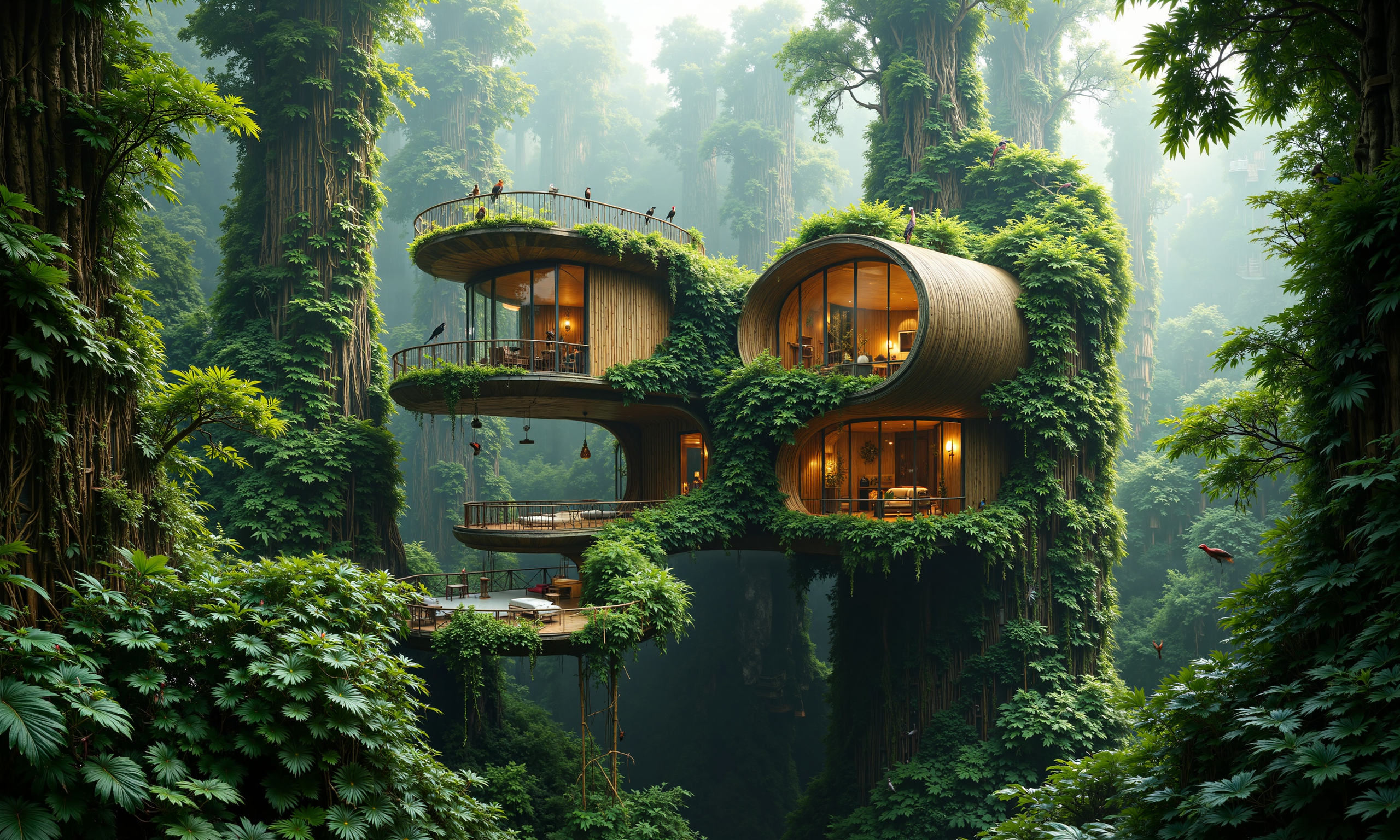 Elevated eco-pod, seamlessly integrated into towering rainforest canopy. Curved organic structure, living walls adorned with vibrant epiphytes. Floor-to-ceiling windows framing lush jungle vistas. Sustainable bamboo and reclaimed wood interiors. Open-air terraces with hanging gardens. Misty atmosphere, dappled sunlight filtering through dense foliage. Rainforest palette: emerald, jade, and earth tones. Tropical birds perched on nearby branches. Verdant understory below. Hyper-realistic, 8K resolution, architectural masterpiece. <lora:FluxMythR3alisticF:0.8> <lora:Kodak Motion Picture Film style v1:0.8> <lora:flux_dev:1>