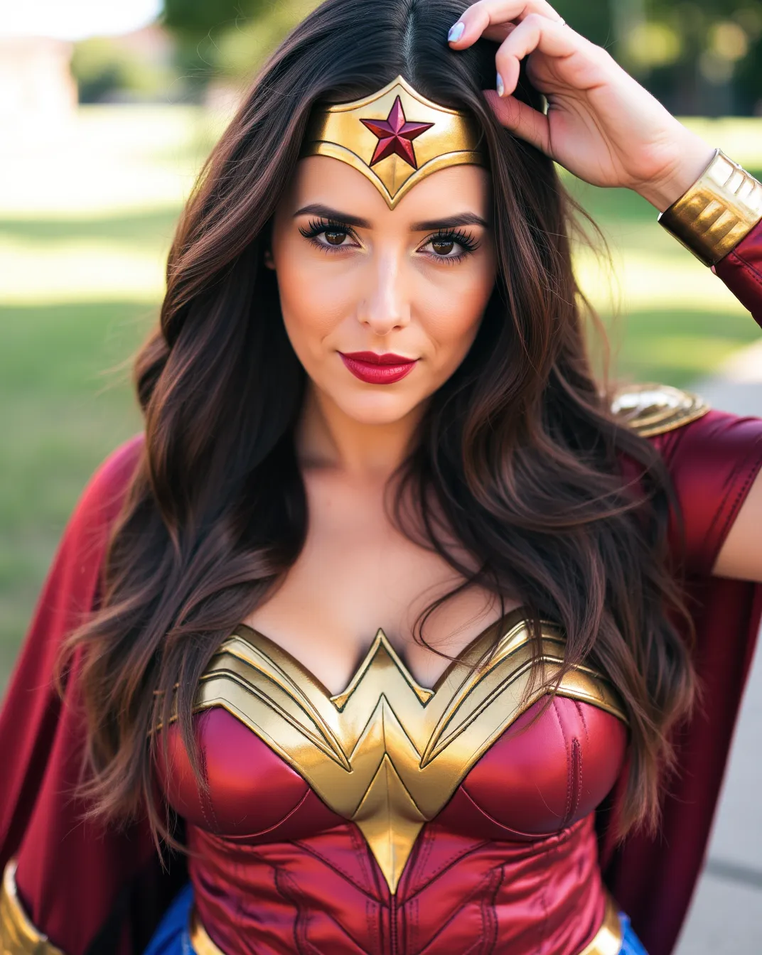 photoshoot of Ola Nowak, female, woman, solo, wonder woman costume, outdoor setting, extreme close up shot.