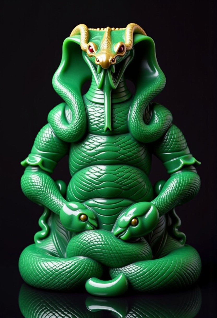 The samurai armor is an overwhelming celebration of the serpent, transforming its wearer into the ultimate embodiment of a snake deity. The breastplate is a colossal sculpture of a coiled serpent, with layers of jade scales so detailed they appear to shift and shimmer in the light. At its center, a massive cobra rises, its hood dominating the chest, fangs poised to strike, and eyes glowing red with ruby inlays. The serpent’s open mouth is carved into the neckline, as if the wearer is emerging from its jaws, symbolizing the fusion of man and beast. The kabuto (helmet) is entirely shaped like the head of a cobra, its hood flaring out to engulf the shoulders. The scales are intricately carved into the jade, each one textured to appear alive. The crest is adorned with a coiled golden serpent, its body wrapping tightly around the helmet, its head positioned directly above the wearer’s brow in a perpetual strike position. A forked tongue of silver extends from its mouth, appearing to flick in anticipation. The shoulder guards are sculpted as two vipers coiling outward, their tails wrapping around the edges and their heads snapping forward aggressively. The arm guards feature a continuous carving of serpents slithering up toward the gauntlets, where the fingers are tipped with claws resembling snake fangs. Each knuckle guard is a cobra’s head, mouths open wide, ready to strike.