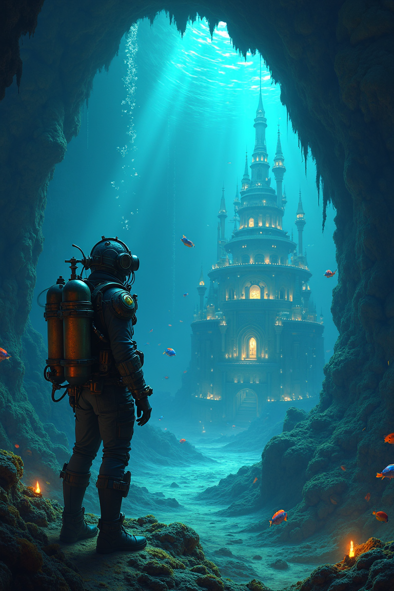 A deep-sea diver in ornate, steampunk-inspired gear pauses at the edge of a hidden underwater city. The city glows with an ethereal, bioluminescent light, a stark contrast to the dark ocean depths. Schools of exotic, glowing fish swirl around the diver, their scales shimmering with vibrant colors. Ancient, barnacle-encrusted artifacts litter the seabed. The diver's oxygen gauge is visibly low. The scene blends the intricate, mechanical details of steampunk with the whimsical, detailed artistry of a Studio Ghibli film