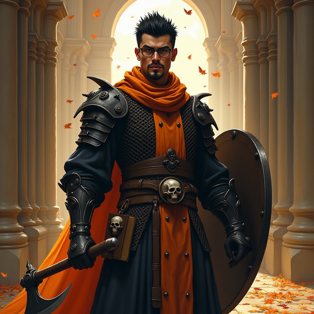 solo, tan-skin, tan-skinned-male, thin-rectangular-glasses, black hair, spiked-hair, short-hair, dark priest robes, orange scarf, autumn, inside, cathedral, skulls on tabards, holding, book with skulls on it hanging from skirt on chain, chainmail shirt over priest robes, black-iron breastplate, black-iron pauldrons, black-iron bracers, buckler shield, large war axe, holding large war axe, noon, goatee