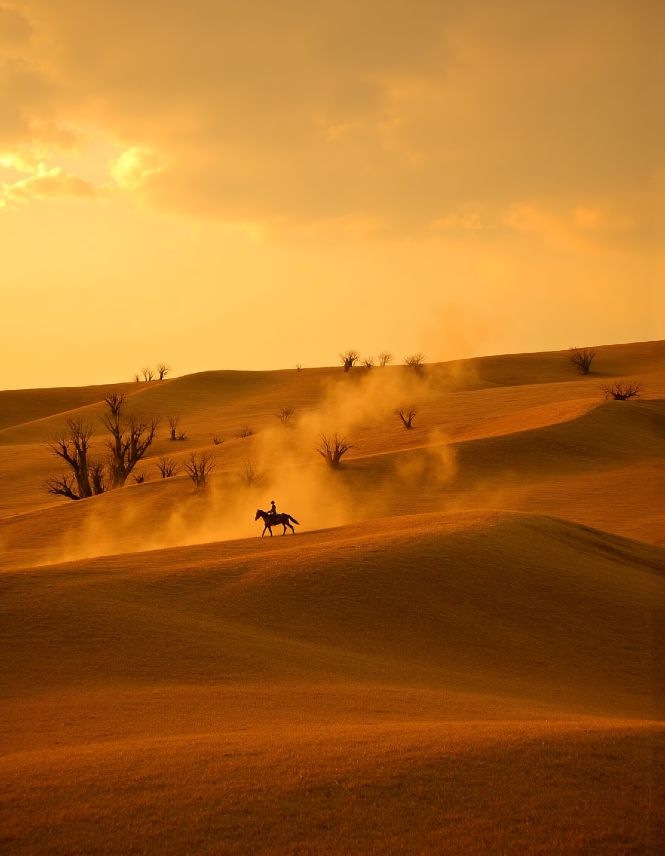A sweeping vista of the Mongolian steppe, bathed in the warm glow of the setting sun. Rolling grasslands stretch to the horizon, punctuated by clusters of gnarled, windswept trees. A lone figure, silhouetted against the fiery sky, rides a sturdy horse across the vast expanse. The air is filled with the scent of dry grass and the distant call of a bird. Dust motes dance in the golden light, creating a sense of movement and depth. The scene is captured with the sharpness and detail of professional photography.