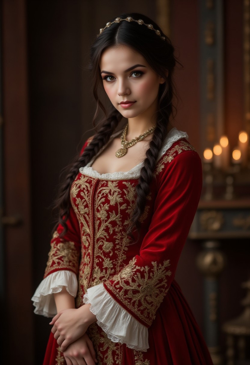 A strikingly realistic midshot portrait of a Hungarian young woman in 17th-century noble attire, captured with the most sophisticated professional cameras and lenses. Her richly embroidered velvet gown features intricate gold and silver threadwork, wide lace cuffs, and a structured bodice, evoking the elegance of the Hungarian aristocracy. Her dark hair is styled in a braided updo, adorned with delicate pearls, and she wears a traditional Hungarian párta (ornamental headdress), signaling her noble status. Her expression is poised and serene, with piercing, intelligent eyes and soft, natural makeup emphasizing her youthful yet dignified beauty. The lighting setup is meticulously adjusted—soft Rembrandt lighting to highlight the depth of textures in the gown, or high-contrast chiaroscuro reminiscent of Baroque portrait paintings. Captured using a Hasselblad X2D 100C with a HC 80mm f/2.8 lens, ensuring an exquisite level of detail in the embroidery and delicate lacework. The background remains simple yet atmospheric, transitioning between a darkened Renaissance-style studio with rich wood paneling and a softly blurred royal chamber bathed in candlelight. Variations include subtle changes in attire, hair arrangement, and accessories, while maintaining the essence of a stunningly lifelike portrait of a noble Hungarian woman from the 1600s. marrta