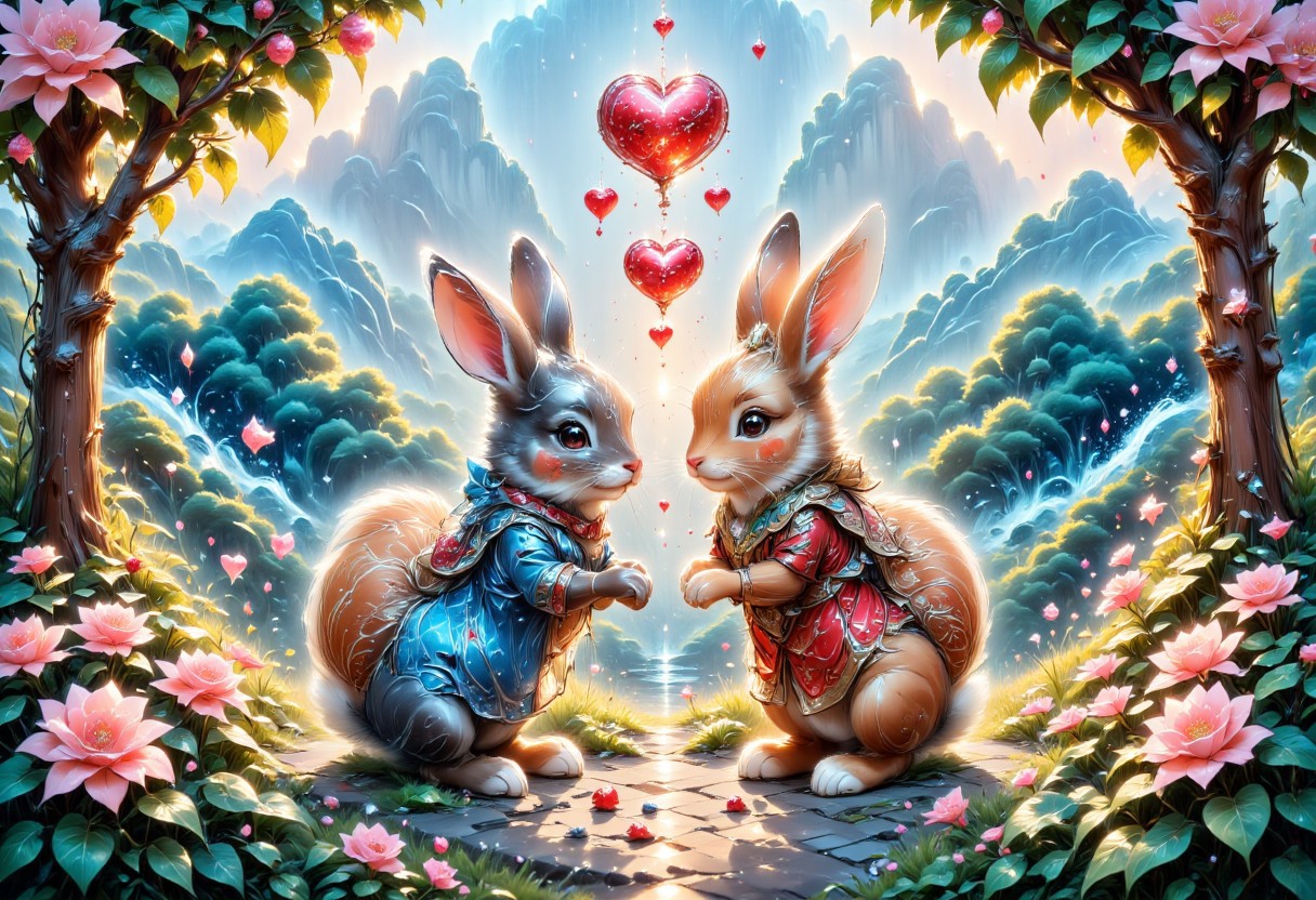 Valentine's Day greetings card with the inscription "Happy Valentines Day!" It shows two adorable rabbits who are in love, creating a magic and bright scene.