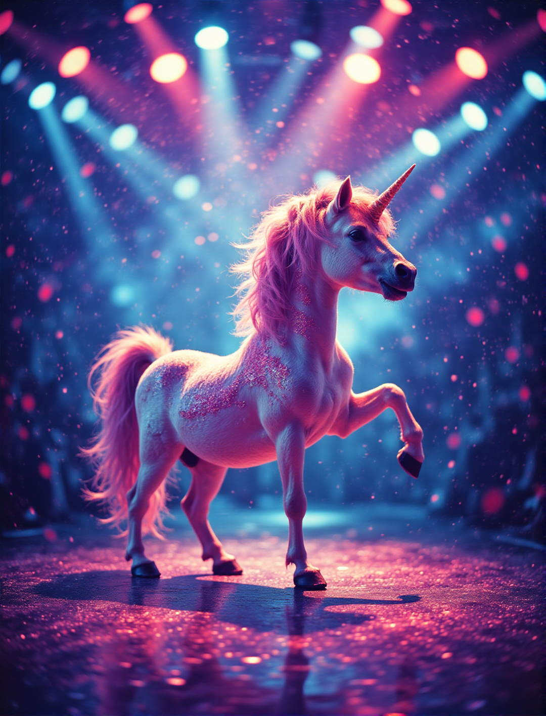 A magical unicorn transforming into a glamorous pop star on a neon-lit stage, wearing a sparkly outfit with its horn now a glittering microphone, surrounded by spotlights and floating musical notes, rainbow mane styled in a trendy hairdo, digital art style with vibrant colors and dynamic lighting effects, capturing the moment of transformation with sparkles and stardust in the air. <lora:Toy_Camera_Flux:0.8>, real,(realistic),photo realistic, photography,highly detailed,(masterpiece),(high quality),best quality,super detailed,full detail,4k,8k,realistic lighting, norender, no anime