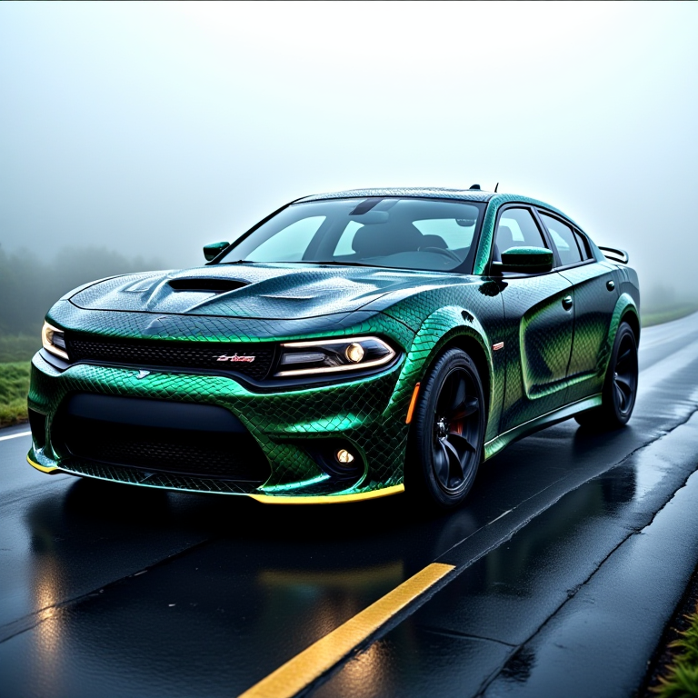 score_9, score_8_up, score_7_up, realistic, sn4k3, A photorealistic portrait of a dodge charger race car with flowing, snake-like paint cascading across the car. Its skin is scaled and iridescent, shifting colors like a snake. The overall aesthetic should be dark, mysterious, and elegant, with a focus on the intricate details of the snake transformations. prioritize its serpentine features, driving down an empty road and fog, full body, SFW, safe for work, PG