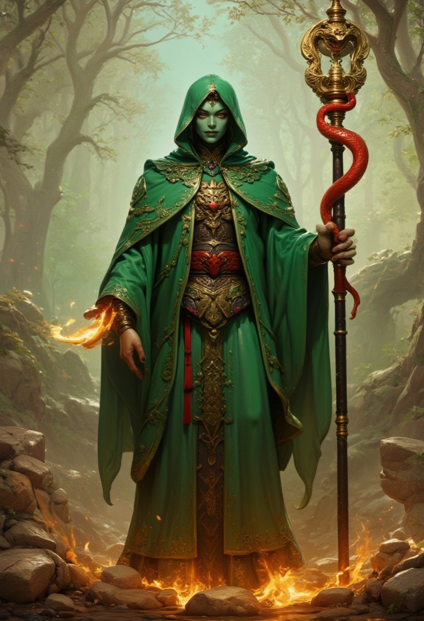 G0thicL1nes, A wizard with jade-colored eyes is standing on the ancient battlefield, he is holding a staff adorned with a red live snake. Hes robe and cloak is green adorned with jade snakes themes. Wizard is casting a fiery fireball with fire swirling around his hands, <lora:jadesnakeflux-000001:1> jade_snake, <lora:FluxMythG0thicL1nes:1>