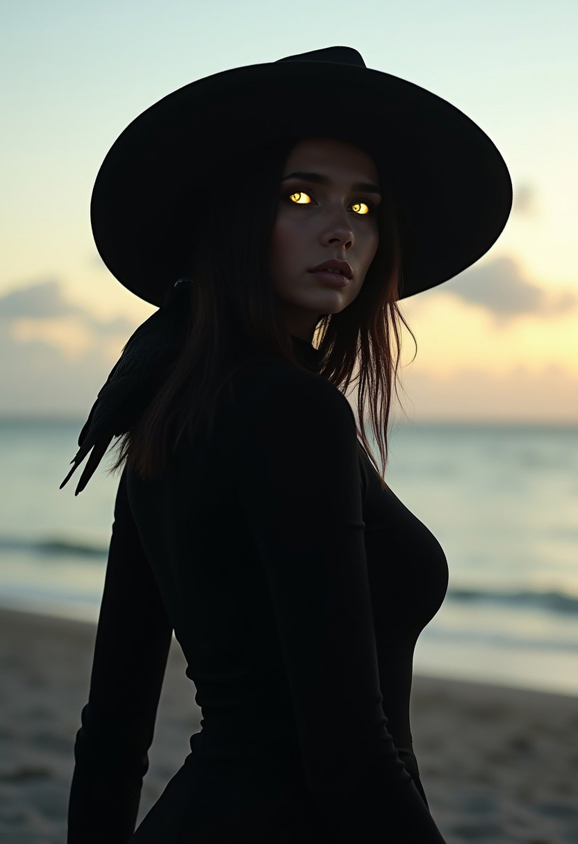 black silhouette of an woman whose eyes are eerily glowing, a raven on her shoulder, black big hat, beach, day light, full body, long shot,