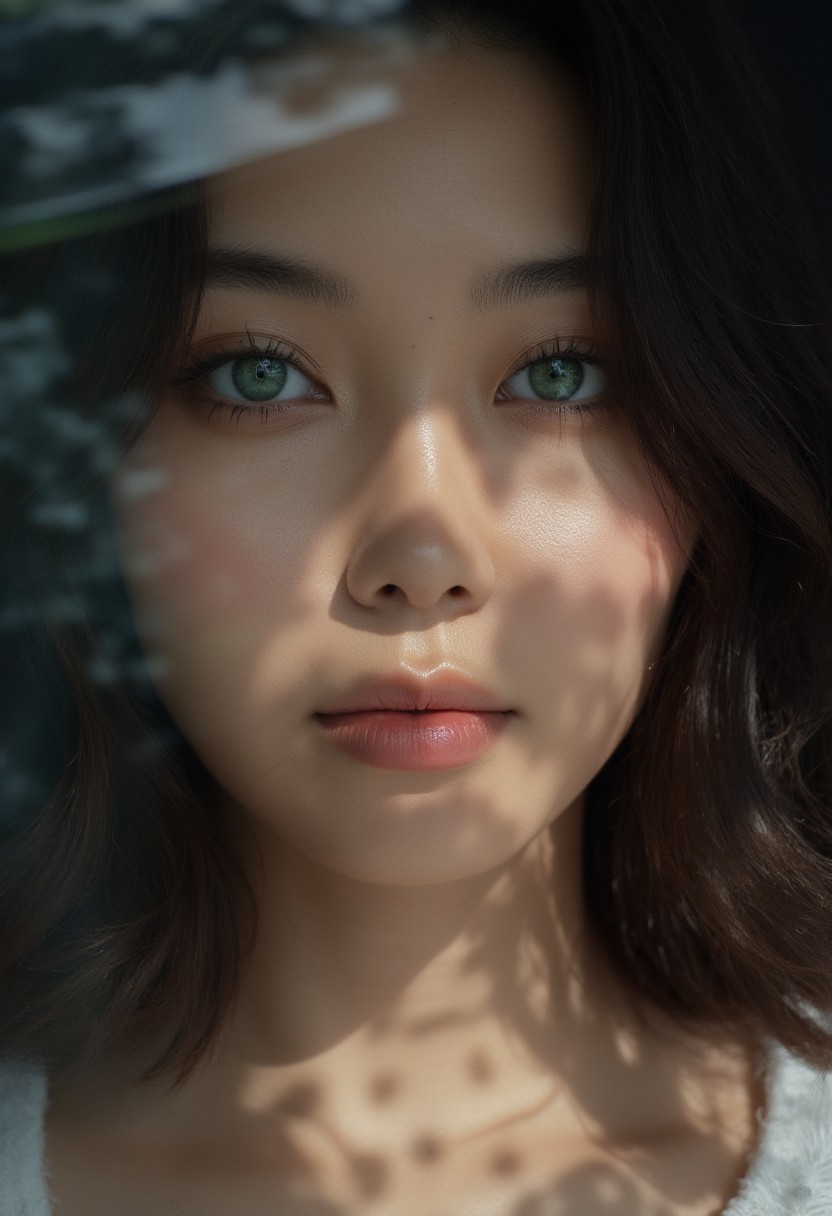 The image is a high-quality photograph featuring an attractive Asian woman with smooth, flawless skin, free of freckles, illuminated by dramatic, high-contrast lighting. makeup, natural youthful glow. Her striking, bright green eyes are vivid and captivating, reflecting the light with depth and clarity. Her gaze is direct yet mysterious, expressing a blend of curiosity and subtle vulnerability. The lighting is diffused through a glass surface, casting soft, dappled shadows across her face for added texture and intrigue. Her hairstyle features medium-length, softly curled dark brown hair with gentle volume, framing her face naturally and elegantly. Her makeup emphasizes her features: a light blush highlights her cheekbones, soft eyeliner enhances her striking green eyes, and a glossy, light pink lip color adds a fresh and polished touch