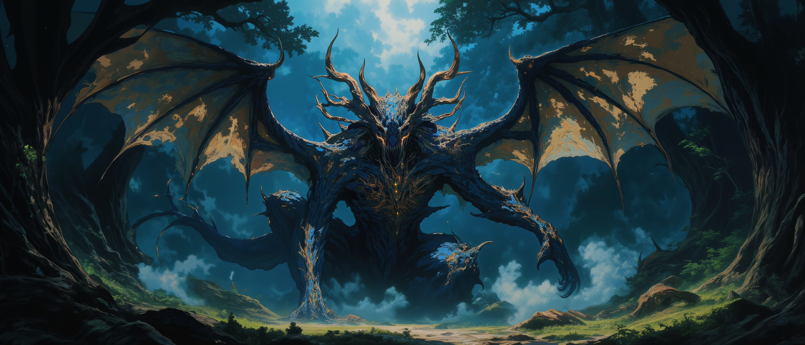 A towering dragon-like creature with iridescent scales, majestic wings spread wide, spiraling horns, and eyes glowing with ethereal power. Its tail adorned with luminescent runes, casting a mysterious aura in a magical forest lit by ambient moonlight. Intricate textures, vibrant colors, ultradetail, and high-resolution cinematic composition evoke epic fantasy ambiance. Mist swirling around the forest floor, enhancing an enigmatic atmosphere, with shadows and highlights that sculpt its muscular form. Masterpiece clarity, sense of wonder, fantasy art style, 8k quality. <lora:FLUX-daubrez-DB4RZ:0.7> <lora:FluxFantasyDetailerV2:0.3> <lora:NeonFantasyPrimeFLUX-000049:0.9>