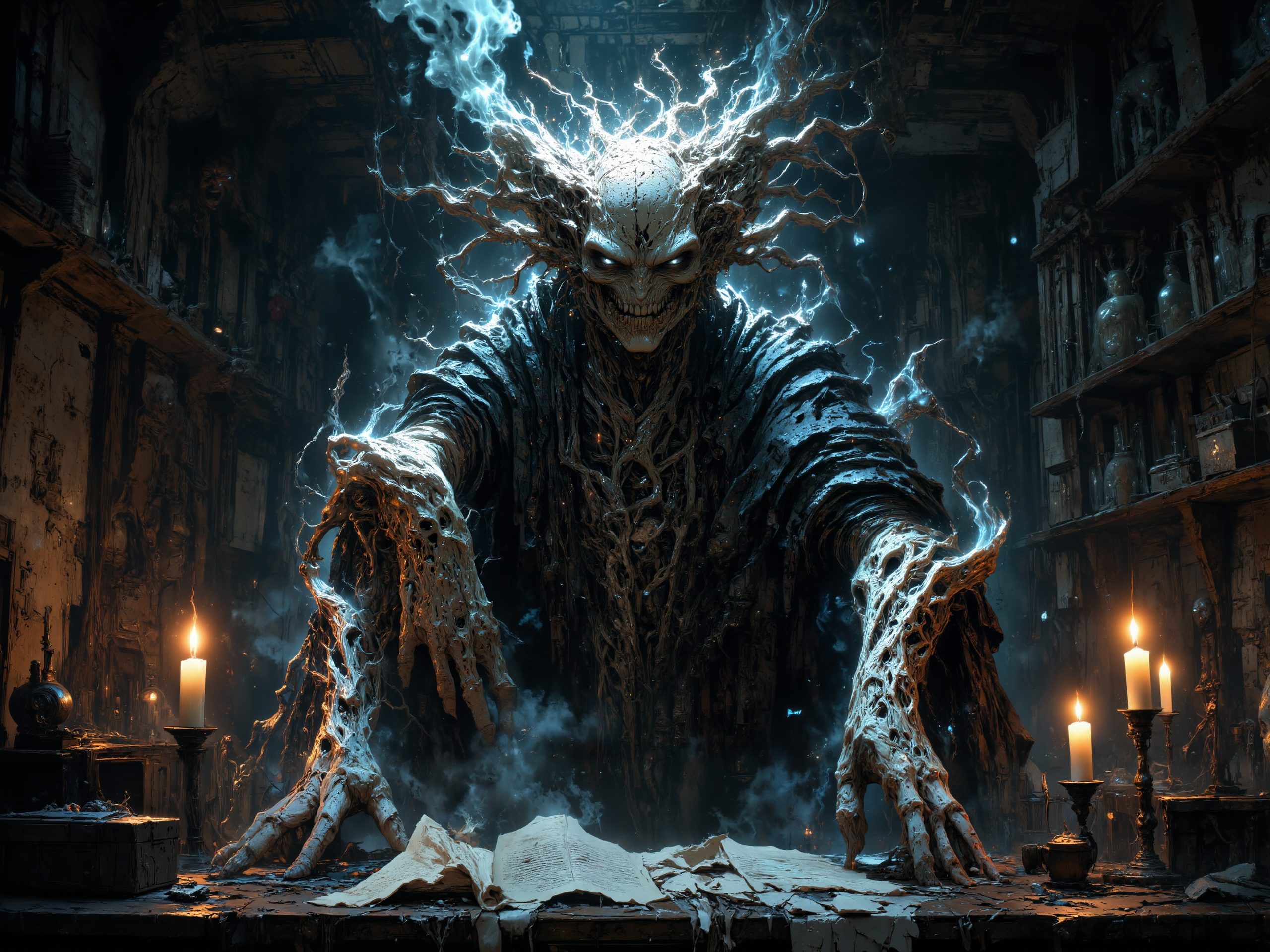 Nightmarish entity, elongated humanoid figure with impossibly thin limbs and distorted proportions, pale translucent skin revealing pulsating veins, hollow sunken eyes glowing with an eerie blue light, twisted mouth filled with needle-like teeth, tattered Victorian-era clothing hanging in shreds, hair like writhing tendrils of smoke, looming over a decrepit abandoned asylum, crumbling walls with peeling wallpaper, rust-stained medical equipment scattered about, flickering shadows cast by guttering candles, oppressive fog creeping along the floor, spectral whispers echoing in the background, hyper-detailed textures, 8k resolution, cinematic lighting with harsh contrasts, photorealistic rendering, unsettling depth of field <lora:FluxMythR3alisticF:0.9> <lora:aidmaMJ6.1-FLUX-v0.4:0.6> <lora:FluxMythP0rtr4itStyle:1> <lora:Anime v1.3:1>