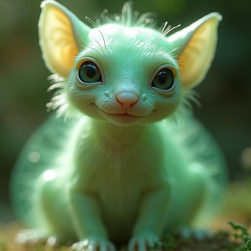 A dreamy, softly lit close-up frames a translucent jade kobold's ethereal face, its gelatinous limbs relaxed in a gentle pose on knees. Warm ambient light from above highlights the delicate features and glistening skin, while a serene expression belies the subject's subtle intensity. The blurred background adds depth to this intimate portrait of a DND-inspired, furry, anthro, humanoid goo-girl with translucent, see-through physiology.