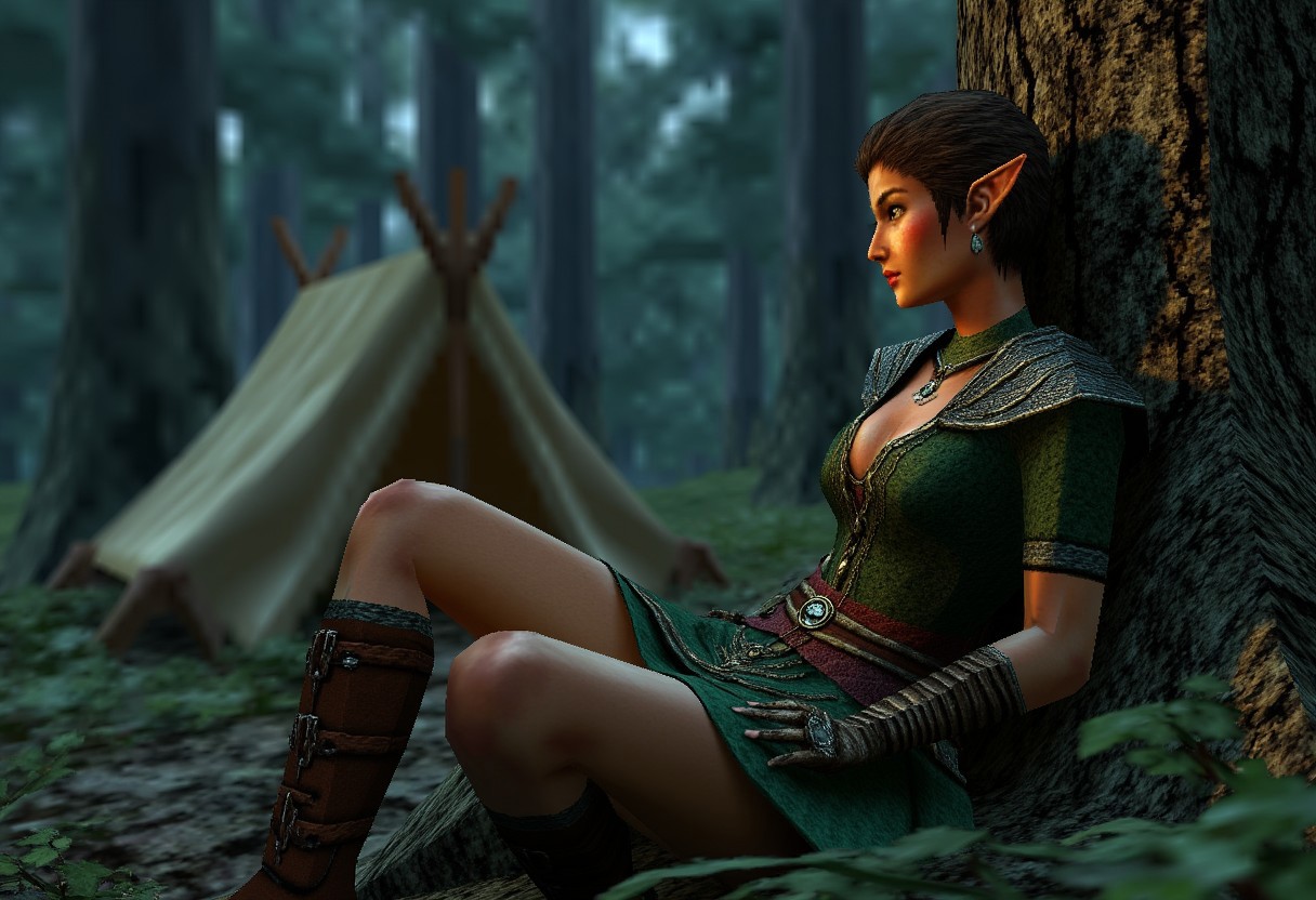 A scene at midnight in a redwood forest. A very muscular and athletic female elven ranger with short brown hair, bronze skin, and intense gold eyes. Her eyes reflect the light of an unseen camp fire and have slit pupils, resembling a wolf's eyes. She's relaxing against a tree, a hide tent in the background, signs of a camp around her. Her butch appearance stands out in simple green " woodsman " attire, complete with a stunning mithril chainmail tunic and a green elven cloak. Realistic detailing reflecting strength, forest-like colors, detailed chainmail texture hinted, specific focus on her short hair, striking gold eyes, and butch demeanor.