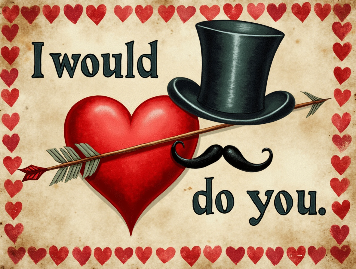 old timey valentines day card with the text "I would so do you", heart with arrow through it, top hat, handlebar moustache