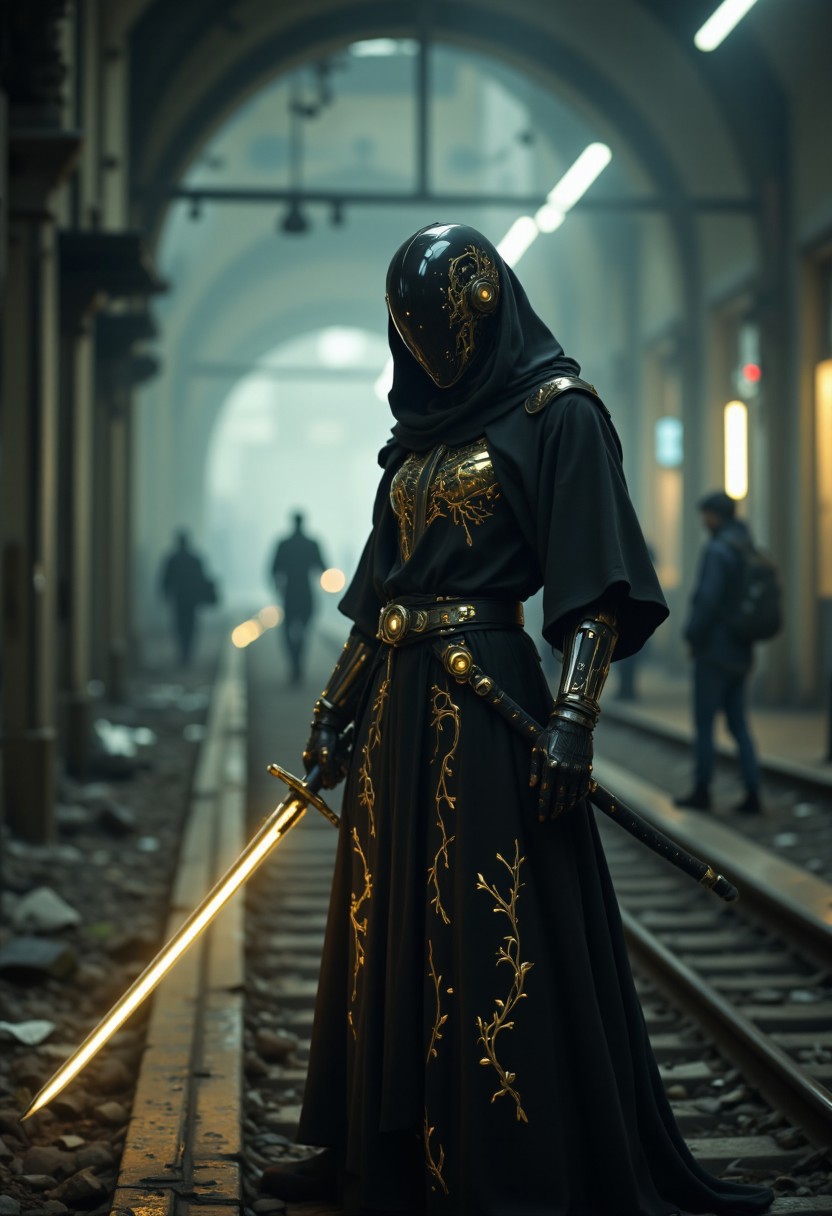 A breathtaking graffitipunk art-nouveau dark fantasy scene. A decayed, neon-lit train station looms in the background, its arched windows etched with elegant, glowing vines. In the foreground, a Female, a lone swordswoman stands, Full Helmet with a Black Mirrored Face Shield, no eyes, their blade pulsing with a dim yellow-gold glow. The figure’s attire is a fusion of Cyborg Power Armor and flowing art-nouveau robes, adorned with intricate patterns of gold and silver circuitry. The atmosphere is suffused with tension, as flickering white fluorescent lights cast haunting shadows, blending urban decay with an air of mystical enchantment