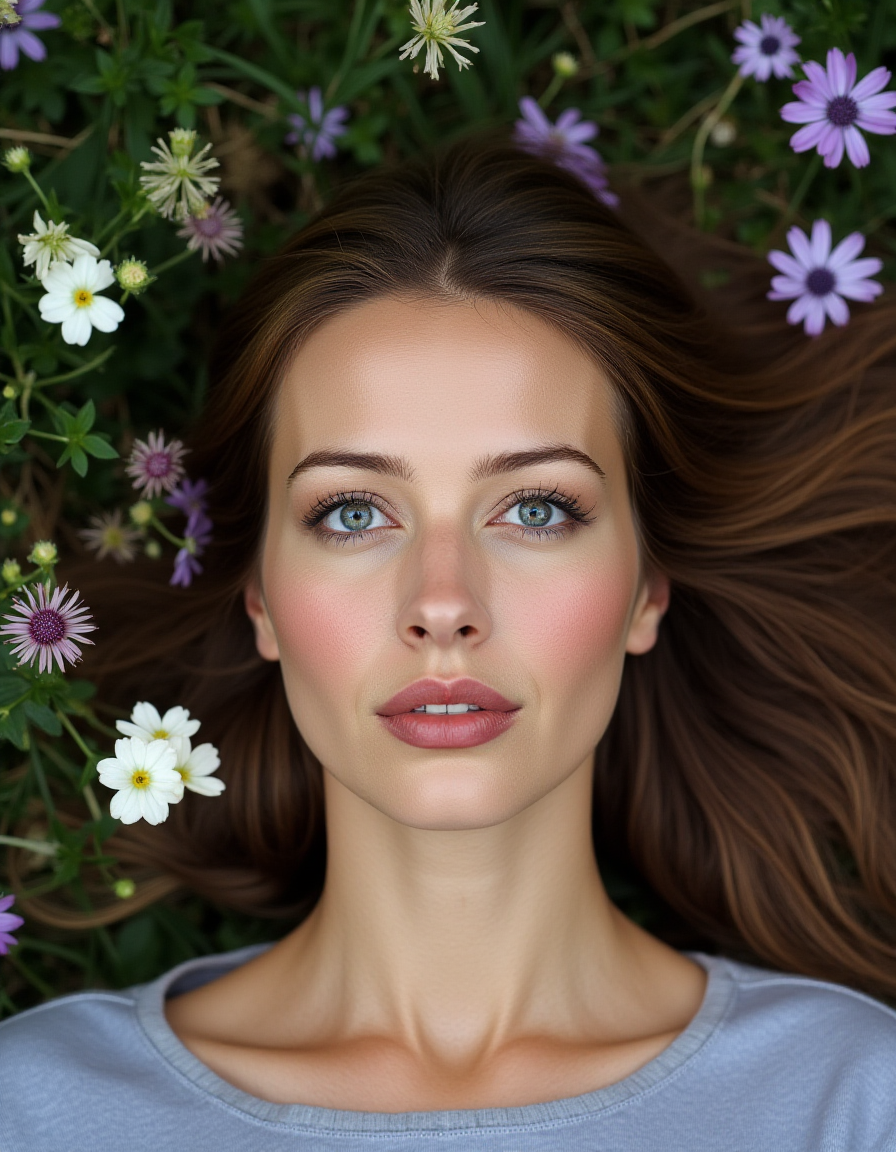 A photo-realistic portrait of a young woman with striking blue eyes,lying in a field of flowers. the woman,who appears to be in her early twenties,has long,flowing light brown hair that falls between her eyes. she is looking directly at the camera with a serene expression,her lips slightly parted,and her nose slightly upturned. her eyes are a striking shade of blue,with long eyelashes that add to her natural beauty. the background is filled with a variety of colorful flowers and greenery,including white and purple flowers,which are scattered throughout the image. the overall effect is one of peacefulness and serenity,with the woman's natural beauty and the soft and natural lighting creating a dreamy atmosphere.,<lora:Winifred_Burkle_Flux:1>,