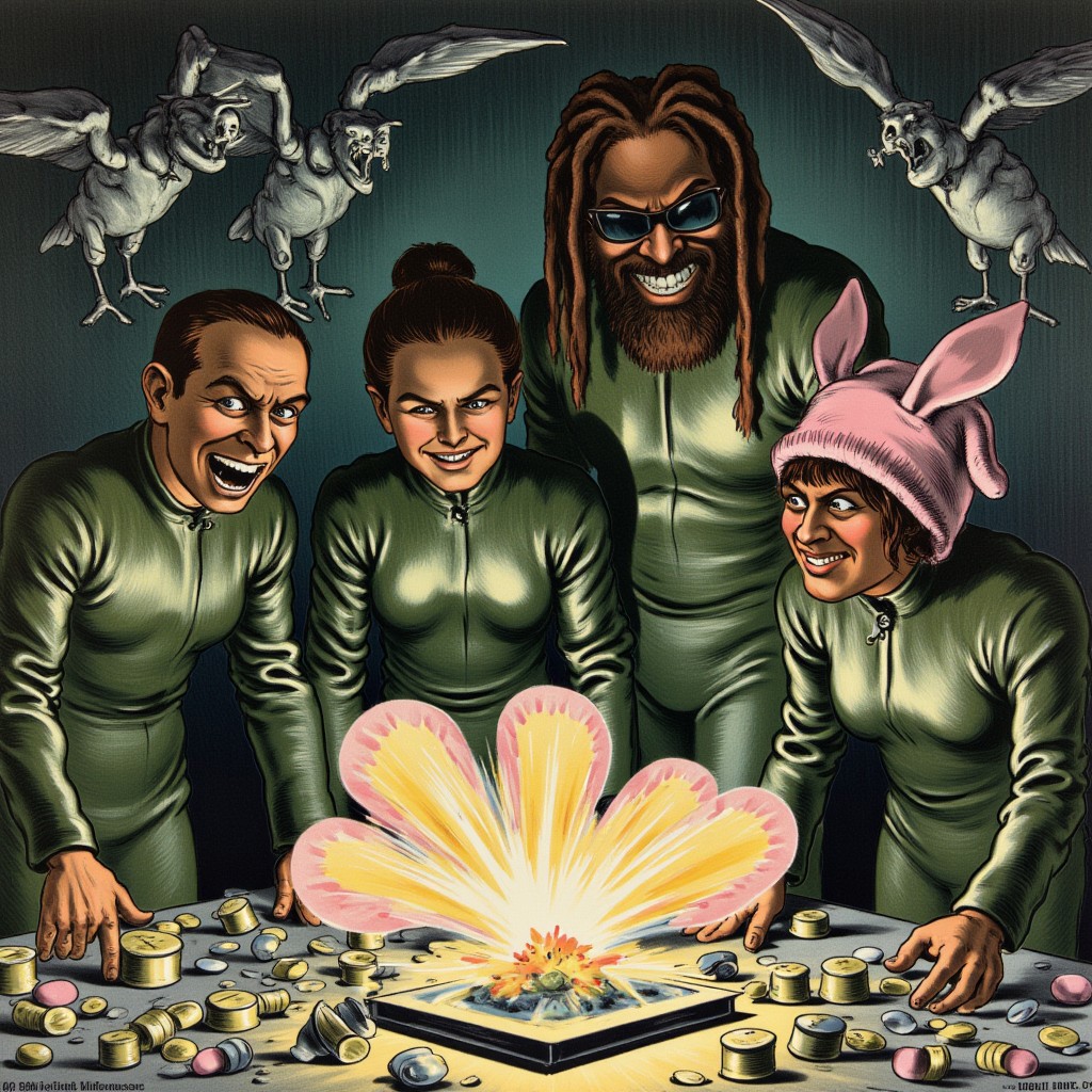 vintage political cartoon illustration. 4 scientists in black and green leather outfits discovering a new chemical in a dark warehouse setting. One scientist should have brown skin and be very skinny laughing menacingly, the other scientist should have brown skin have long dreads covering their face completely and they are calm and serious, the other scientist should be tall and burly with long hair and a long beard and should have a sinister smile with black sunglasses, the last scientist should have brown skin and wearing a pink beanie that resembles bunny ears. They are surrounded by robotic vultures and different forms of currency and pills looking for some type of cure. An explosion from the chemicals should create a fire in the lab.