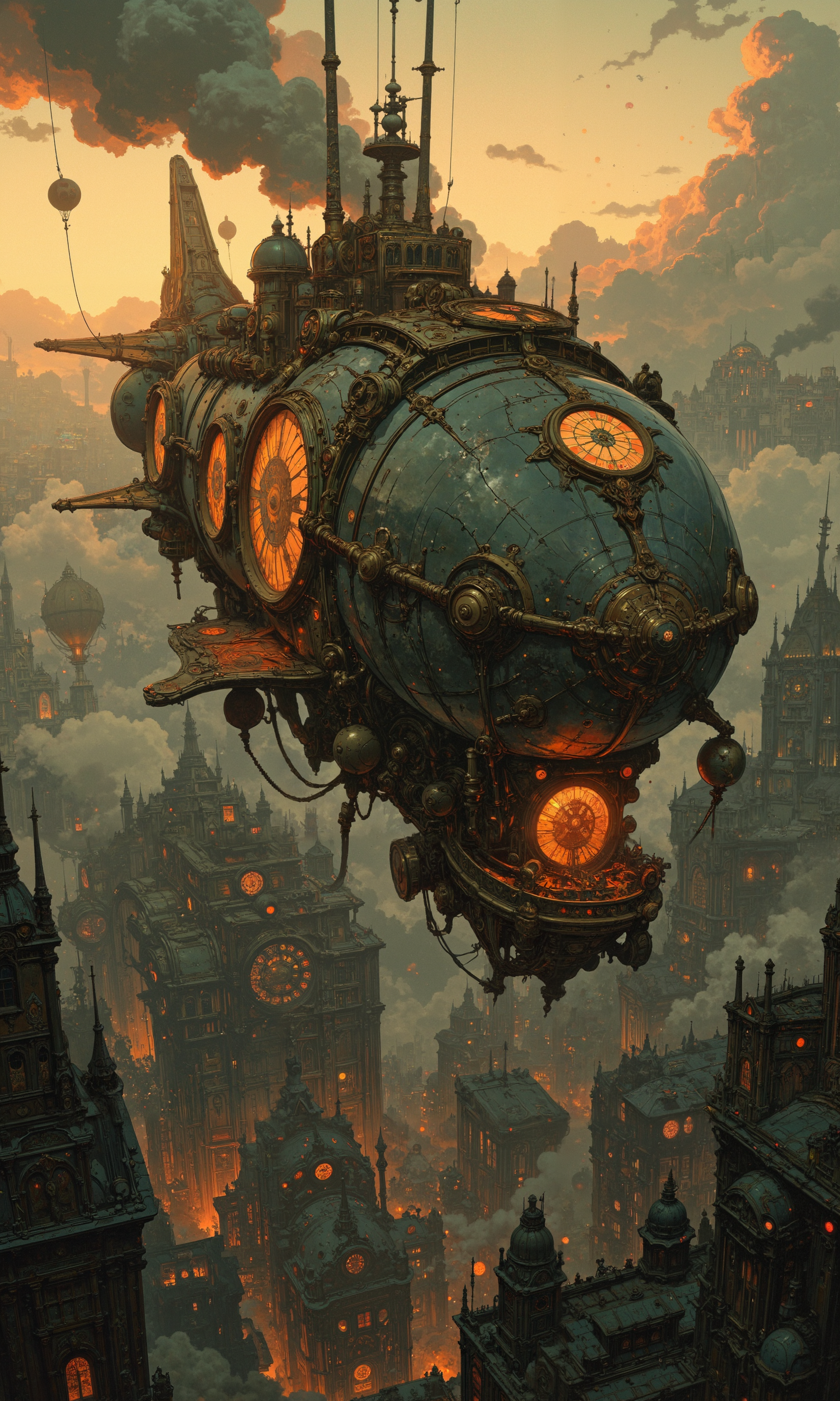 Colossal steampunk zeppelin, ornate brass and copper plating, intricate gears visible through translucent panels, floating majestically above a sprawling Victorian cityscape. Billowing steam clouds, multiple propellers spinning, gondola adorned with stained glass windows. Crew in elaborate uniforms tend to steam-powered machinery on deck. City below shrouded in fog, gaslit streets barely visible. Airship's shadow looms over miniature buildings. Sunset sky, warm golden light glinting off metal surfaces. Hot air balloons and smaller airships in background. Hyper-detailed 8K rendering, photorealistic textures, dramatic lighting, cinematic composition, deep focus, intricate steampunk aesthetics <lora:DND_GRAINYBOYZ_FG_FLUX_V2_ROMULUS_Lora:0.7> <lora:MoriiMee_Gothic_Niji_Style_FLUX:0.6> <lora:Anime v1.3:0.6> <lora:Let_It_Blaze_in_Crimson_anime_v1.0:0.5> <lora:flux_dev:1>