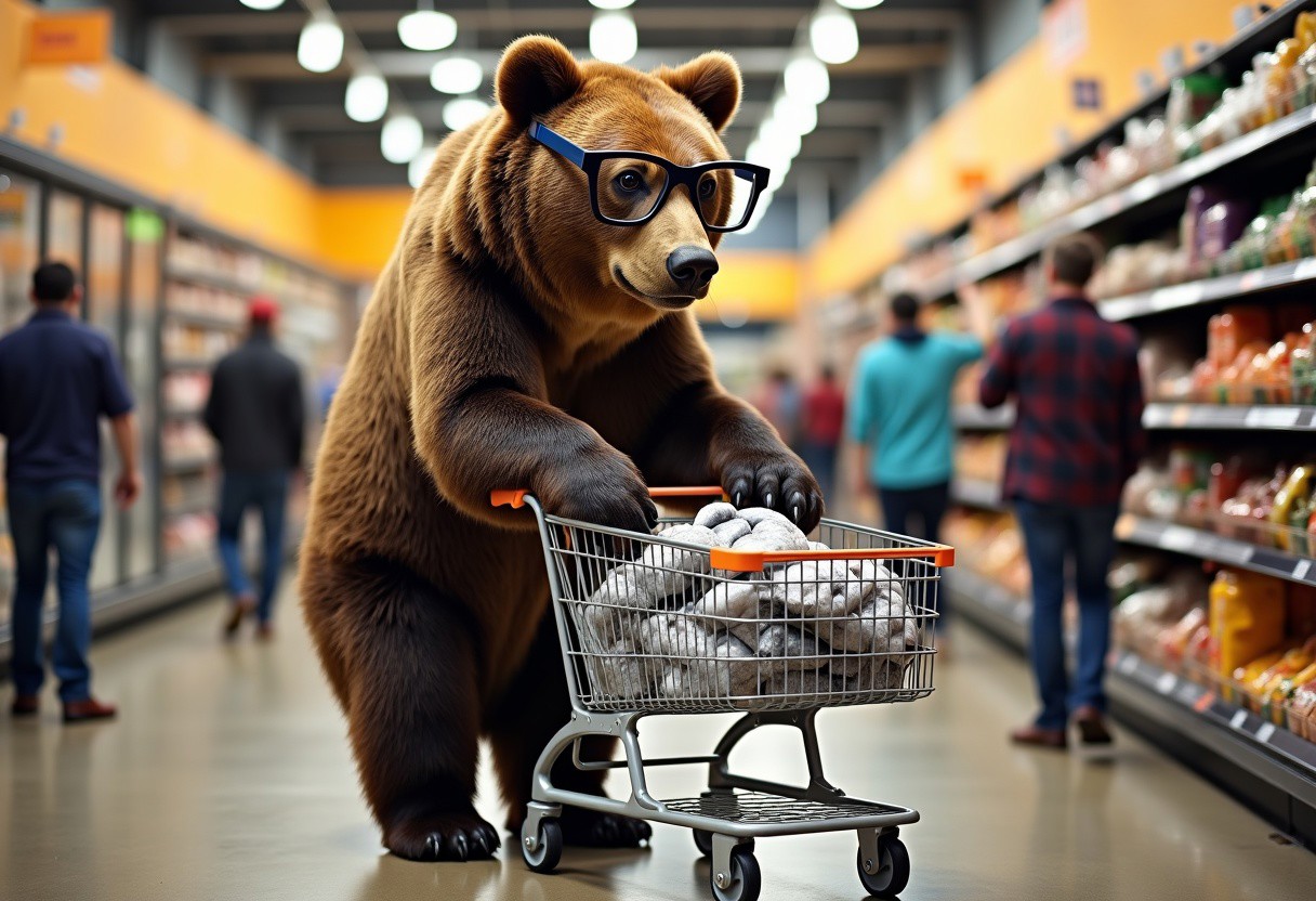 score_9, score_8_up, score_7_up, realistic, photo, high quality, extreme detail, photogenic, (((photorealistic))), best quality, realistic lighting, source_photo, a brown bear is in a grocery store pushing a shopping cart, the bear is putting frozen fish into its shopping cart, the shopping cart is full of fish, other grocerie shoppers are waving at the bear, the bear is wearing Groucho glasses, beaglepuss, the other shoppers think the beare is a fellow human because if its disguise, funny, goofy, a little stupid and probably slightly artistic,