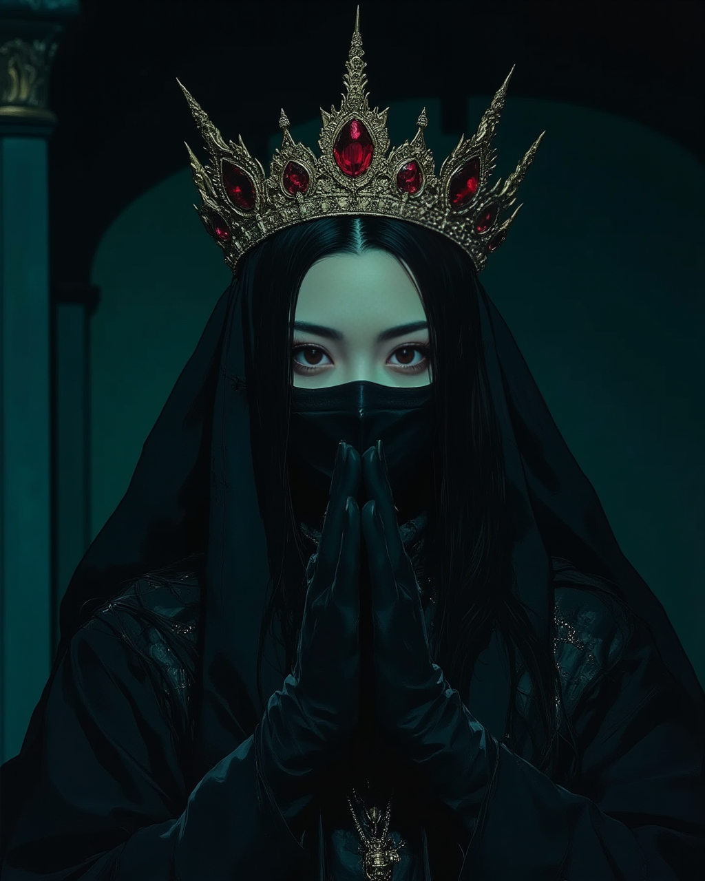 pingtu style, illustration-fen, In this captivating dark fantasy portrait, a mysterious veiled queen stands proudly, exuding an aura of power and silent command. Her face, partially obscured by an enigmatic veil, is shrouded in shadow and intrigue. The queen's ornate crown, adorned with striking crimson details, contrasts against the deep teal and black color palette. The low-key lighting creates a dramatic atmosphere, with shadows adding depth to the exquisite textures of her regal attire. The background is dark and mysterious, heightening the sense of secrecy and allure. The cinematic style, achieved through a shallow depth of field and high ISO for grain, combined with a 85mm lens, captures the queen's regal presence in a realistic yet dreamlike manner., dark fantasy, cinematic <lora:pingtu:0.9>,