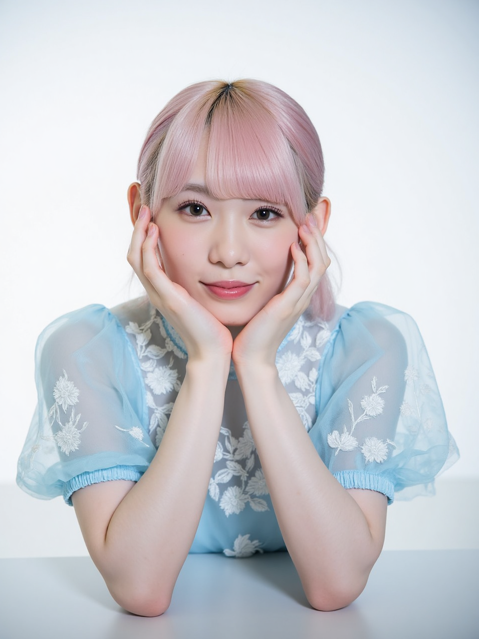 miichan, The image is a photograph featuring a young woman with a fair complexion and shoulder-length, straight, pastel pink hair, styled in two low ponytails. She has a delicate, oval face with soft features, including a small nose and full lips painted with a natural pink lipstick. Her eyes are large and almond-shaped, framed by long, dark lashes, and she is looking directly at the camera with a gentle, almost melancholic expression.  She is dressed in a sheer, light blue blouse with intricate white floral embroidery, which adds a touch of elegance to her appearance. The blouse is semi-transparent. The sleeves of the blouse are short and slightly puffed, adding to the soft, feminine aesthetic of her outfit.  Her posture is relaxed yet poised, with her left arm bent at the elbow and her hand resting on her cheek, while her right arm is extended forward, supporting her weight. The background is a smooth, gradient white, which contrasts with her light-colored attire and adds a sense of minimalism and calm to the image. The overall mood of the photograph is serene and intimate, capturing a moment of quiet contemplation.
