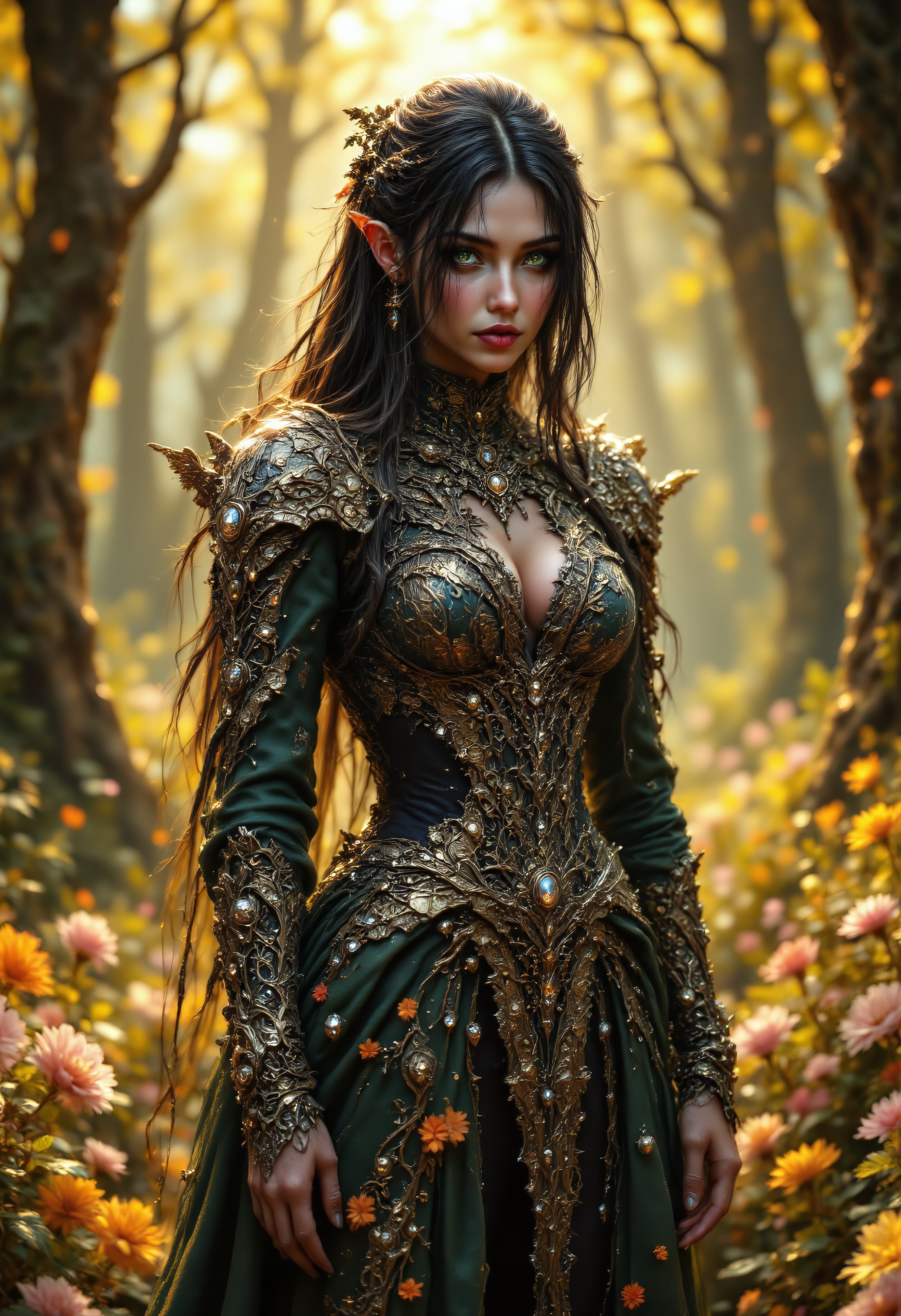 (aidmafluxpro1.1, R3alisticF) A serene fantasy Elf stands majestically, basking in the warm, golden sunlight, clad in intricately designed, free-flowing armor that appears to be a harmonious blend of silver and gold, with delicate, ethereal engravings that shimmer in the light. The gentle, natural lighting accentuates her slender, elongated ears and elegant features, and her piercing emerald eyes sparkle with an otherworldly intensity. Her raven-black hair cascades down her back like a waterfall of night, with subtle, wispy strands framing her heart-shaped face. The armor, adorned with tiny, glittering gemstones, drapes elegantly around her slender physique, accentuating her lithe, athletic build. The surrounding environment is a lush, vibrant forest, with towering trees and colorful wildflowers swaying gently in the breeze, evoking a sense of tranquility and peace. 8k highest resolution with sharp intricate details.