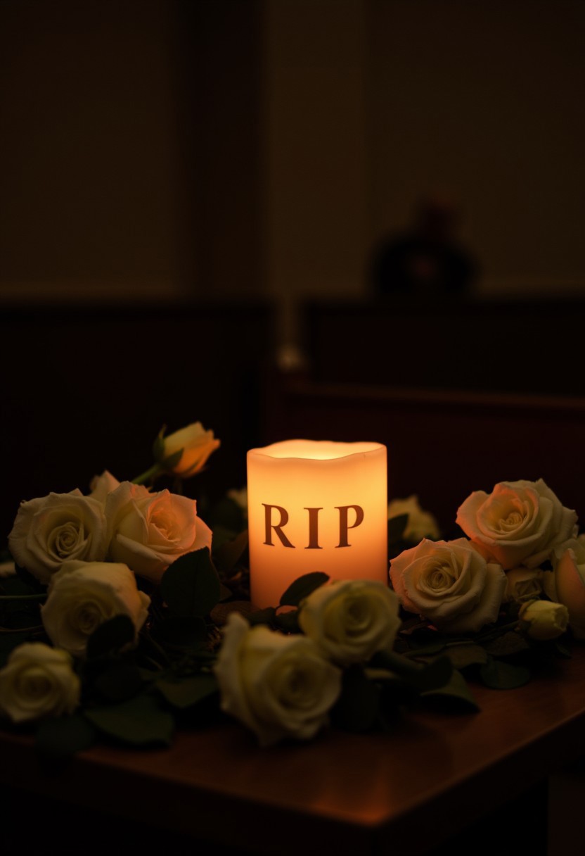 "In a solemn church setting, a candle with the letters 'RIP' carved into its wax sits on an altar surrounded by delicate white roses. The dim lighting accentuates the deep sadness, while the soft flicker of the flame brings a sense of reverence and reflection." , aidmafluxpro1.1, aidmaHyperrealism,