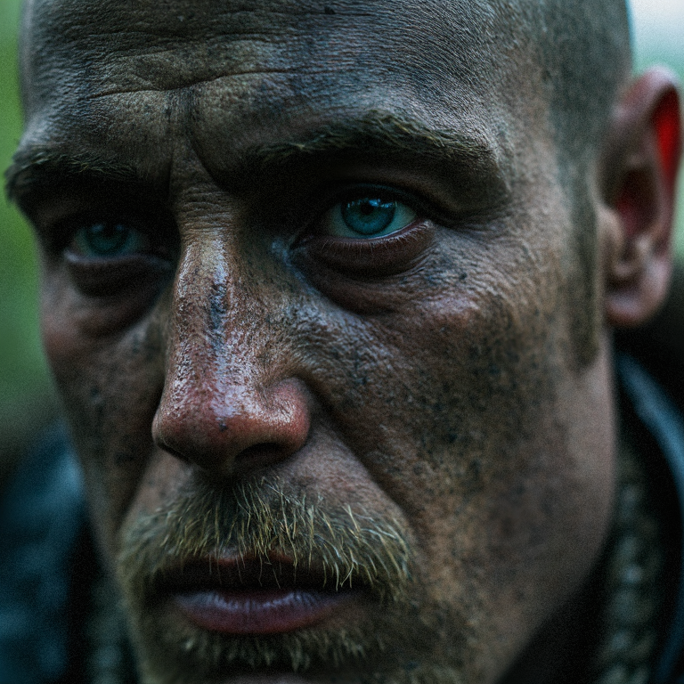 Horror-themed (extreme close shot of eyes :1.3) of nordic man, (war face paint:1.2), mohawk haircut wit thin braids, runes tattoos, sweat, (detailed dirty skin:1.3) shiny, (epic battleground background :1.2), . analog, haze, ( lens blur :1.3) , hard light, sharp focus on eyes, low saturation, by ilya kuvshinov and flora bosil <lora:add_detail:0.7> . Eerie, unsettling, dark, spooky, suspenseful, grim, highly detailed