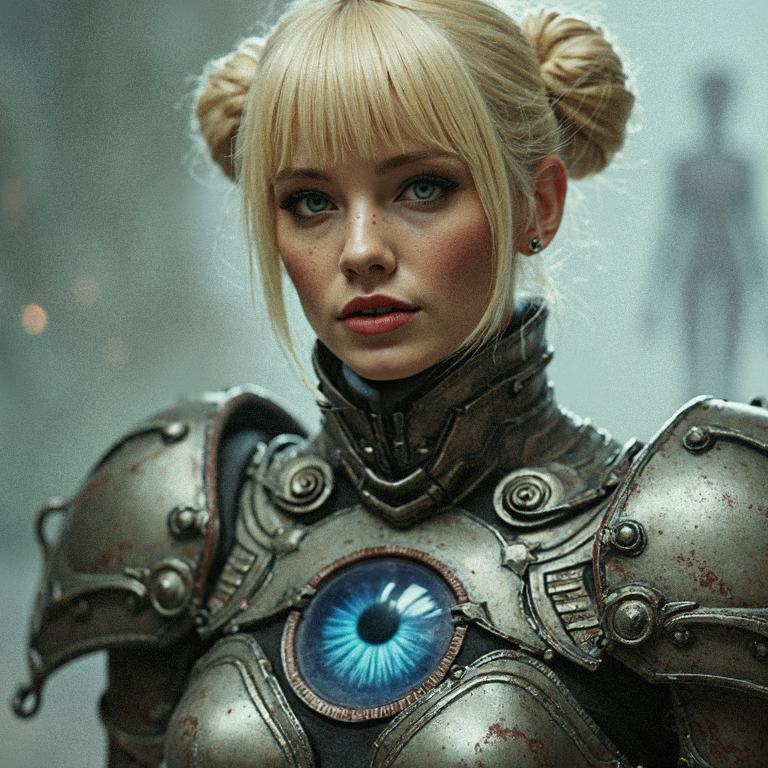 A striking conceptual portrait of a female character from a dark fantasy universe. She has blonde hair styled in two high buns, blue eyes, and freckles. Her metallic armor, adorned with intricate mechanical components, emphasizes her strength and determination. The prominent blue circular eye on her chest seems to hold a mysterious power. The abstract background, with hints of pale colors and a faint silhouette of a humanoid figure, adds depth and intrigue to the scene. The overall composition is cinematic, blending elements of painting and conceptual art to create a captivating and otherworldly atmosphere., portrait photography