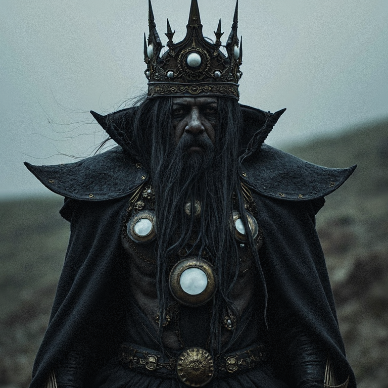 symmetrical full shot of the underworld king, extremely old, small white eyeballs, long wet hair, grunge clothes, grunge black armour, grunge black golden jewelry, grunge black crown, hyper realistic, ultra detailed, translucent black skin, black skin, mist, wind