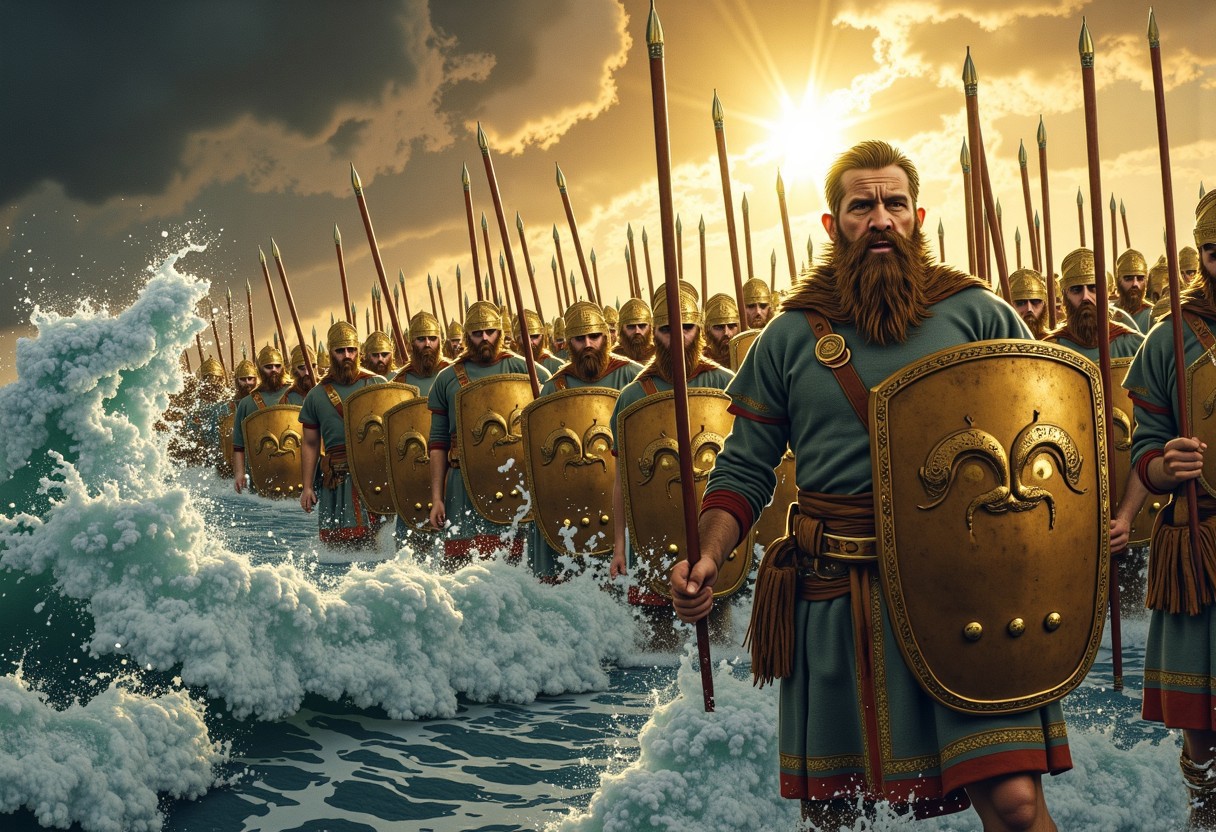 A close-up of a high-resolution action scene in the formation of a phalanx, soldiers emerging from the depths of the ocean to the shore under a stormy wind and a hurricane. The massive gilded shields of the Swan-emblazoned warriors combine to form an unbroken wall of metal as they hold their long spears at the ready. The water spray of the storm violently swirls around them, hitting the air, obscuring the perspective and darkening the sky. The sun struggles to break through the thick, swirling storm clouds, dramatic rays of light that illuminate the soldiers in a golden, moist glow and brilliance.. At the front, the commanding officer stands tall, his face, with a huge beard, half hidden by the chaos of the storm. He shouts a powerful, cohesive war cry, his voice barely cutting through the howling winds, but still carries a sense of determination and unity. The soldiers, grim behind their visors, hold fast, their shields battered by the storm, but unsurpassed. The scene is dynamic and tense, with the fury of an ocean storm and contrasts with the calm, disciplined determination of the soldiers. The storm rages around them, but the light from the struggling sun highlights the play of light in the splashes of water, the courage and defiance of the unit, strong against the elements and the impending battle
