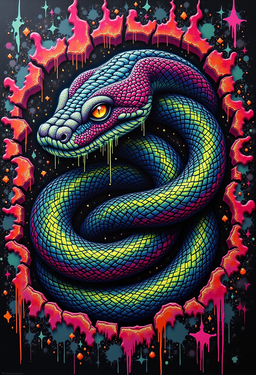 SnakeMythosDaal. A vibrant and dynamic graffiti piece featuring a colossal, coiled snake bursting through a cracked wall. The snake’s body is covered in intricate, glowing scale patterns with a gradient of toxic green, electric blue, and neon purple. Its eyes blaze bright yellow, and its fangs drip venom in vivid, fluorescent streaks. The background is a chaotic splash of graffiti-style textures—splattered paint, jagged lines, and bold, angular shapes in black, red, and orange. Coiling around the edges of the piece are stylized smoke trails and venom drips, giving the artwork a sense of movement and intensity, as if the snake is alive and ready to strike.